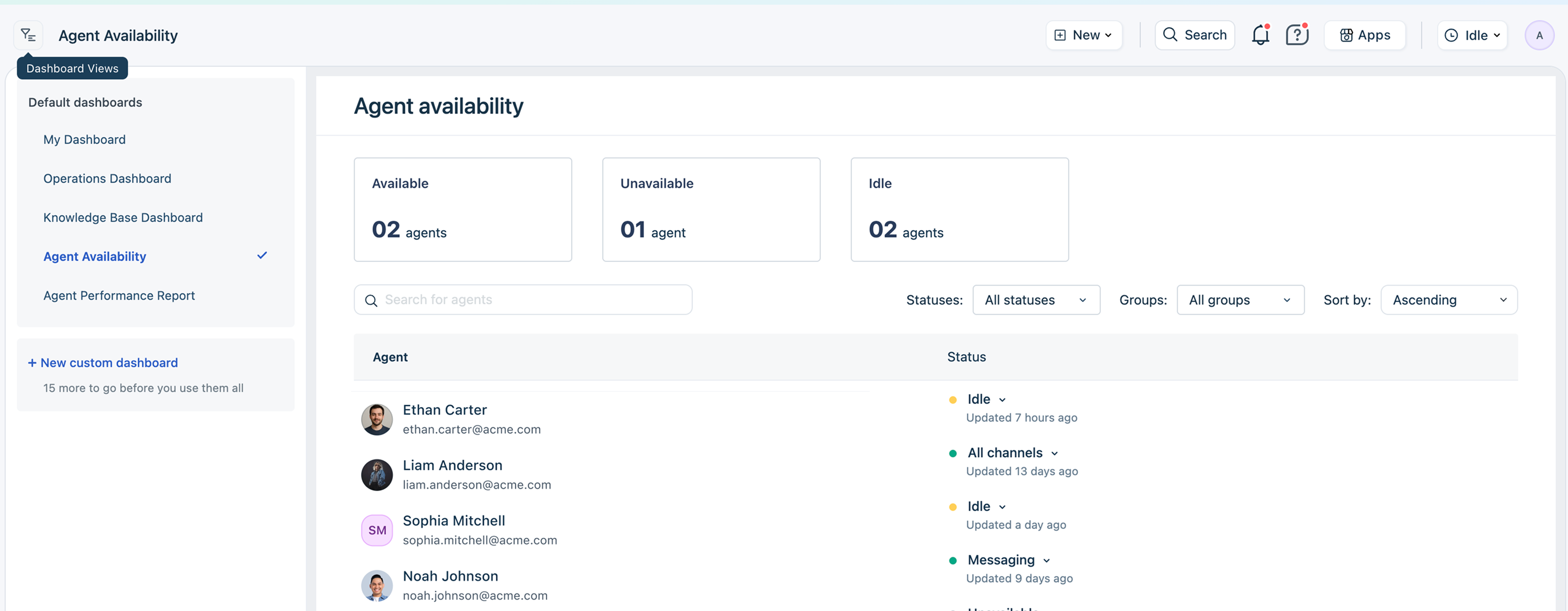 Displays each agent’s name, email, current status, and last updated time. - Filters and sorting