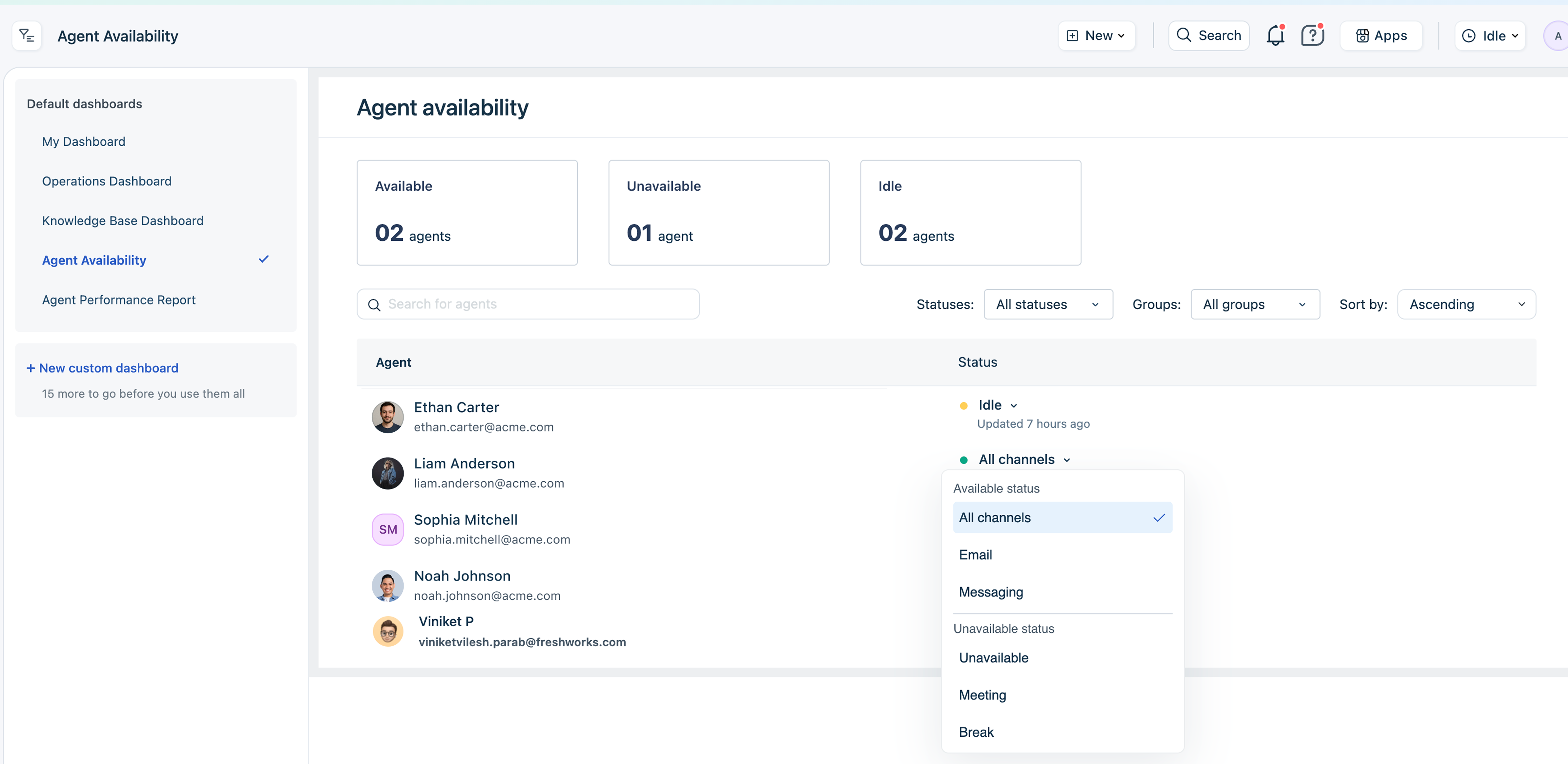 The Agent Availability Dashboard provides a consolidated view of your team’s availability across all queues (channels) and helps you monitor real-time statuses and know who is available to receive tickets and attend calls.