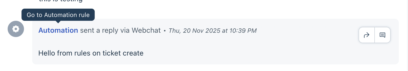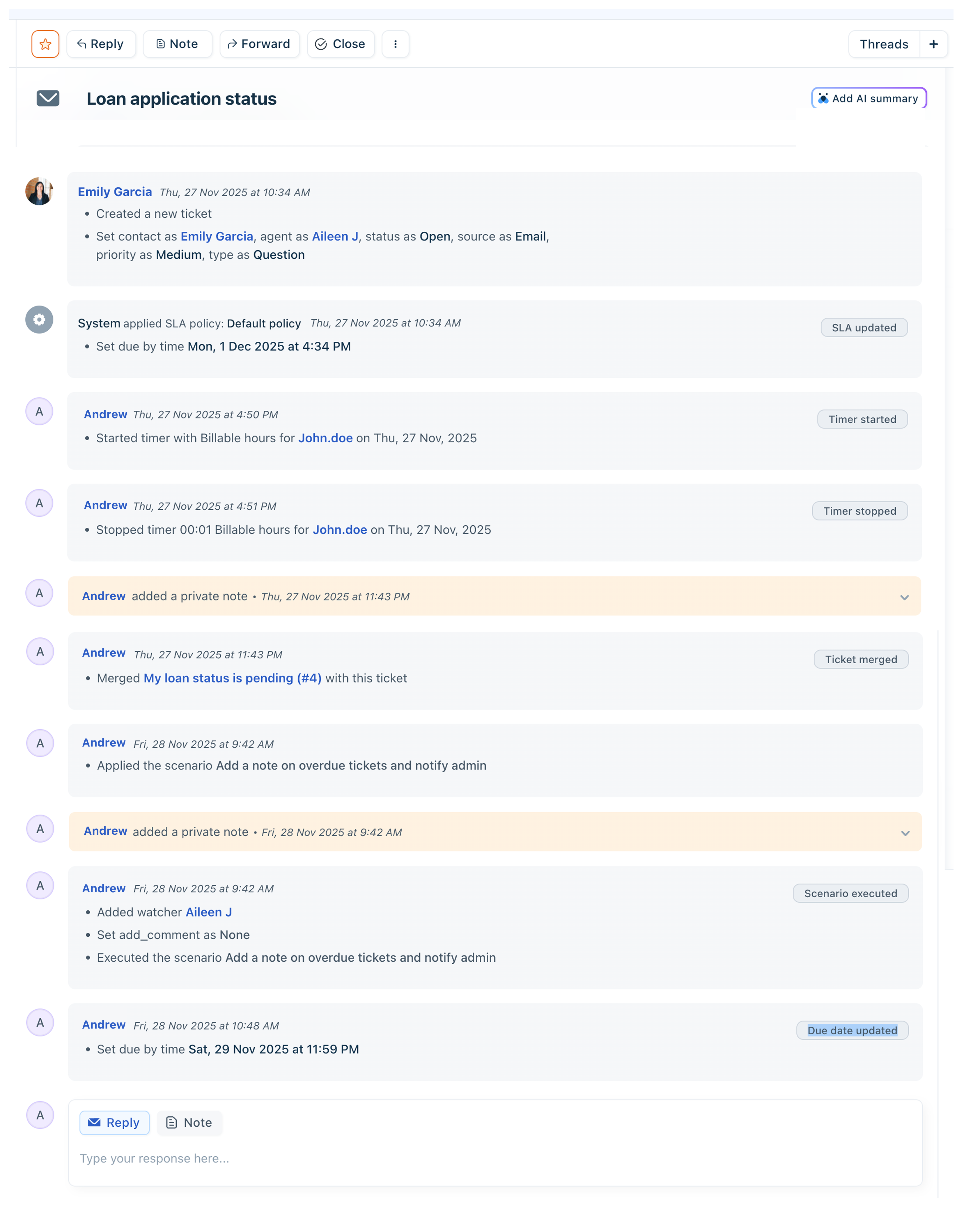 - Admins can review the complete ticket history, including responses, field changes, and automation rules executed.