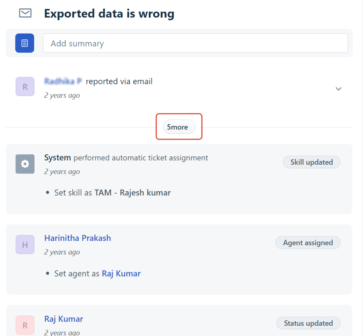 - If there are more than 3 responses/notes, the entire conversation, except the ticket description and the last 3 responses is collapsed.