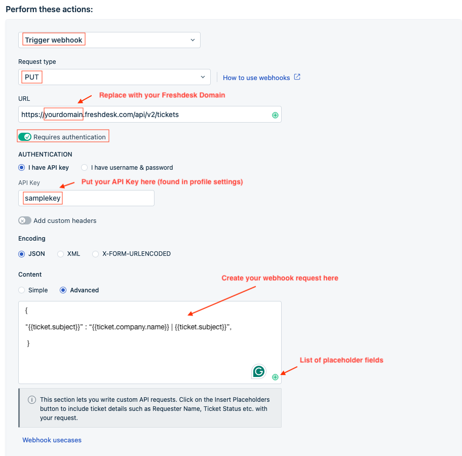 - Select Advanced to write a custom API request. You can make dynamic API requests using placeholders. See Freshdesk API Reference.