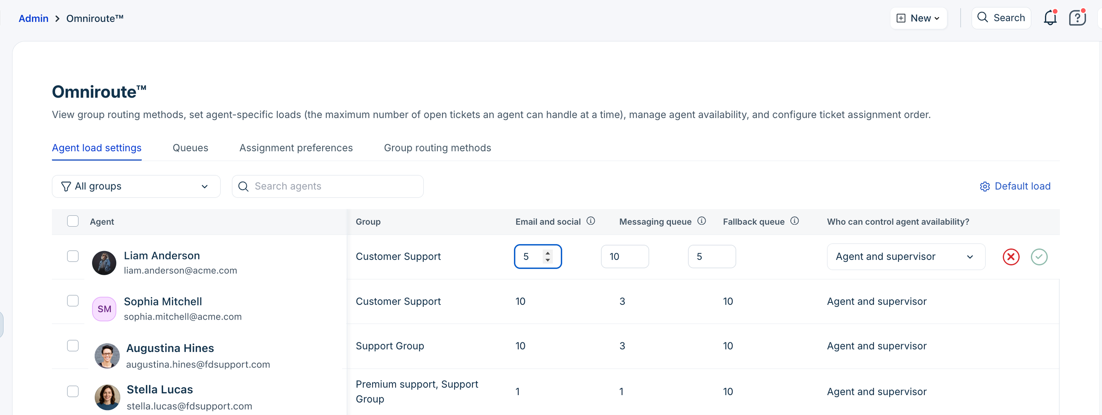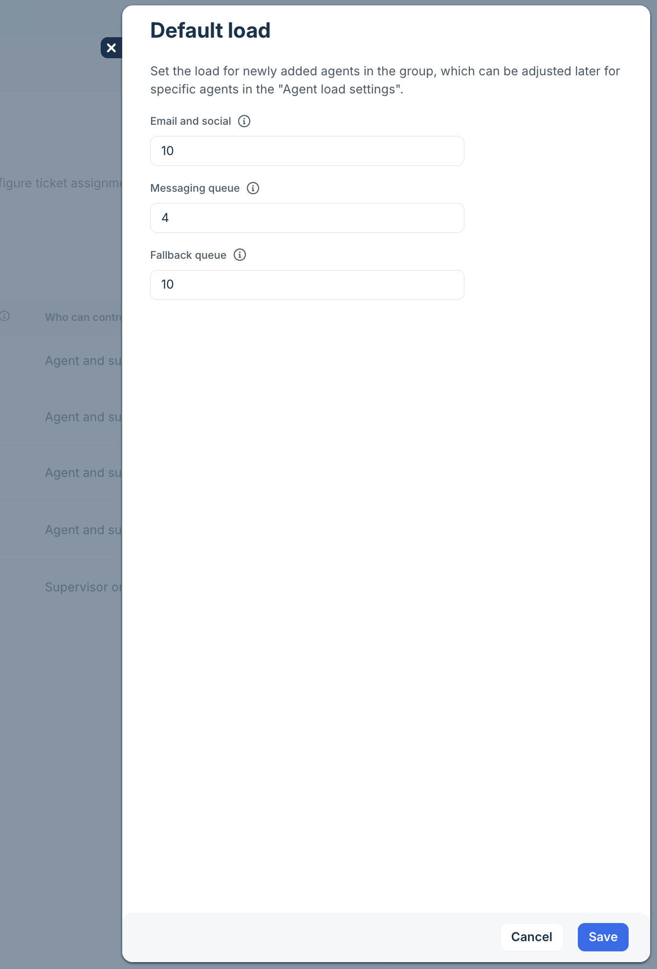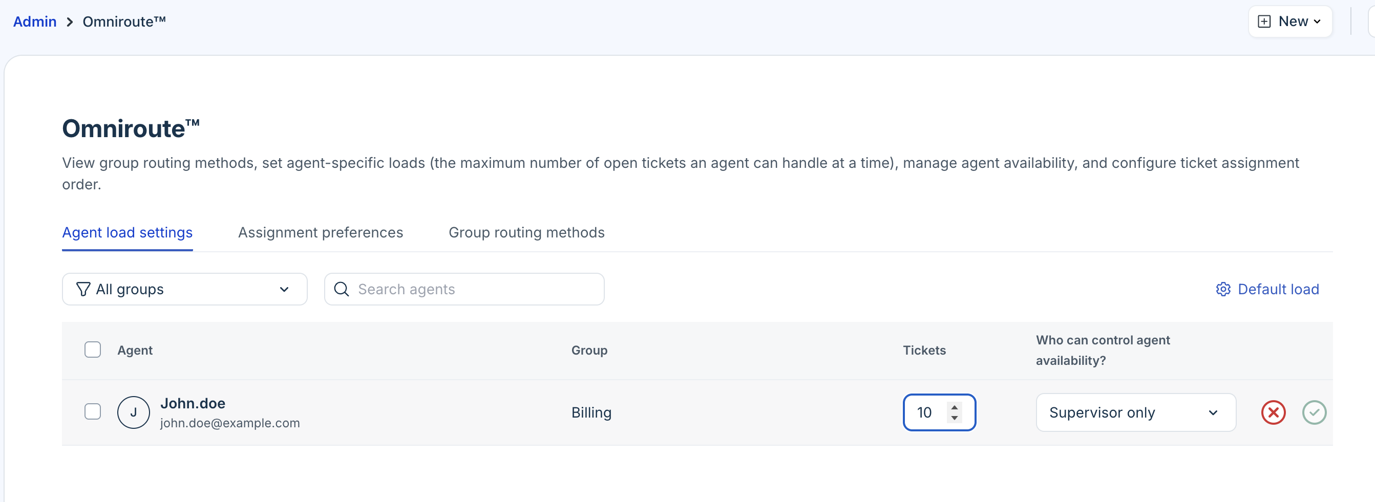 - Agent load settings: Configure ticket handling capacity for each agent.