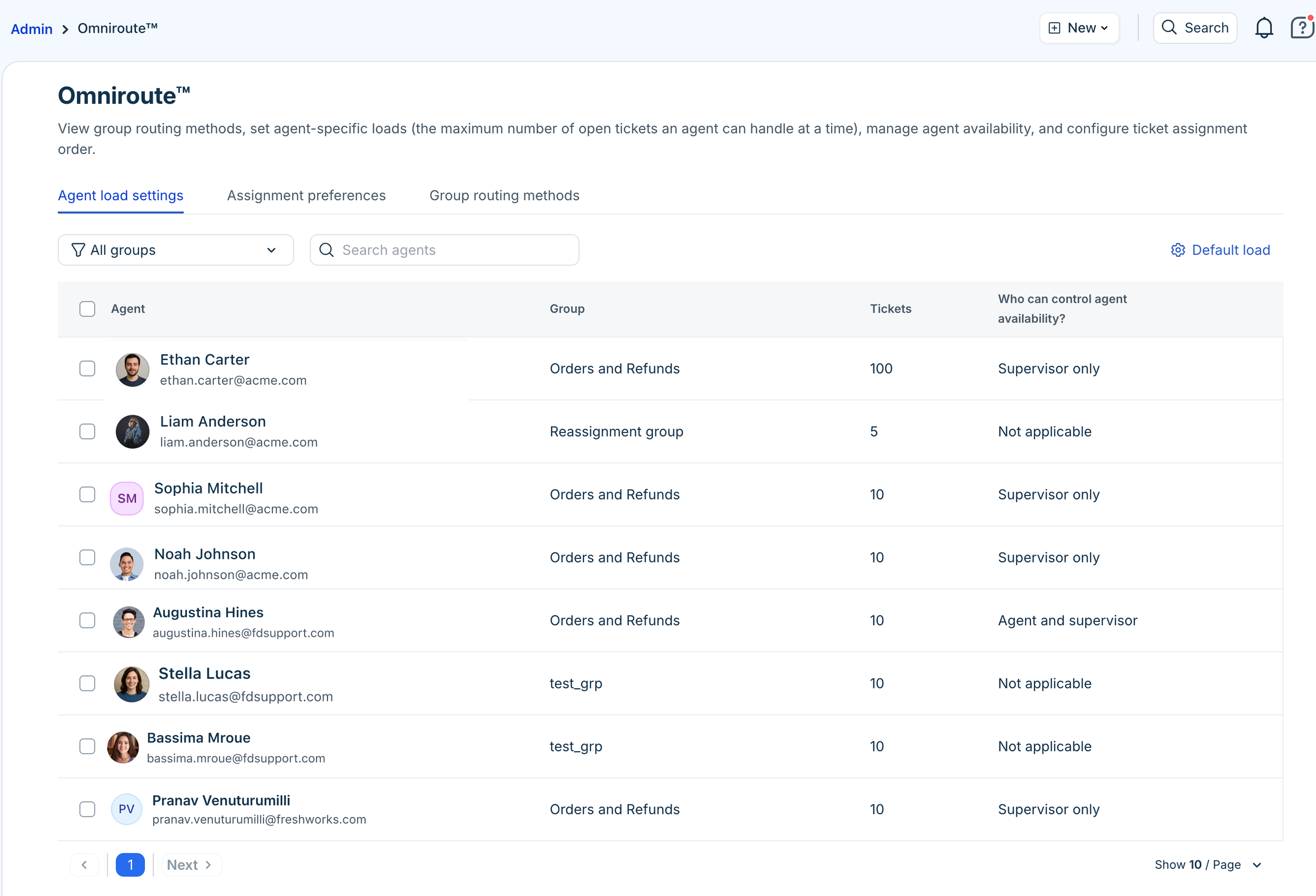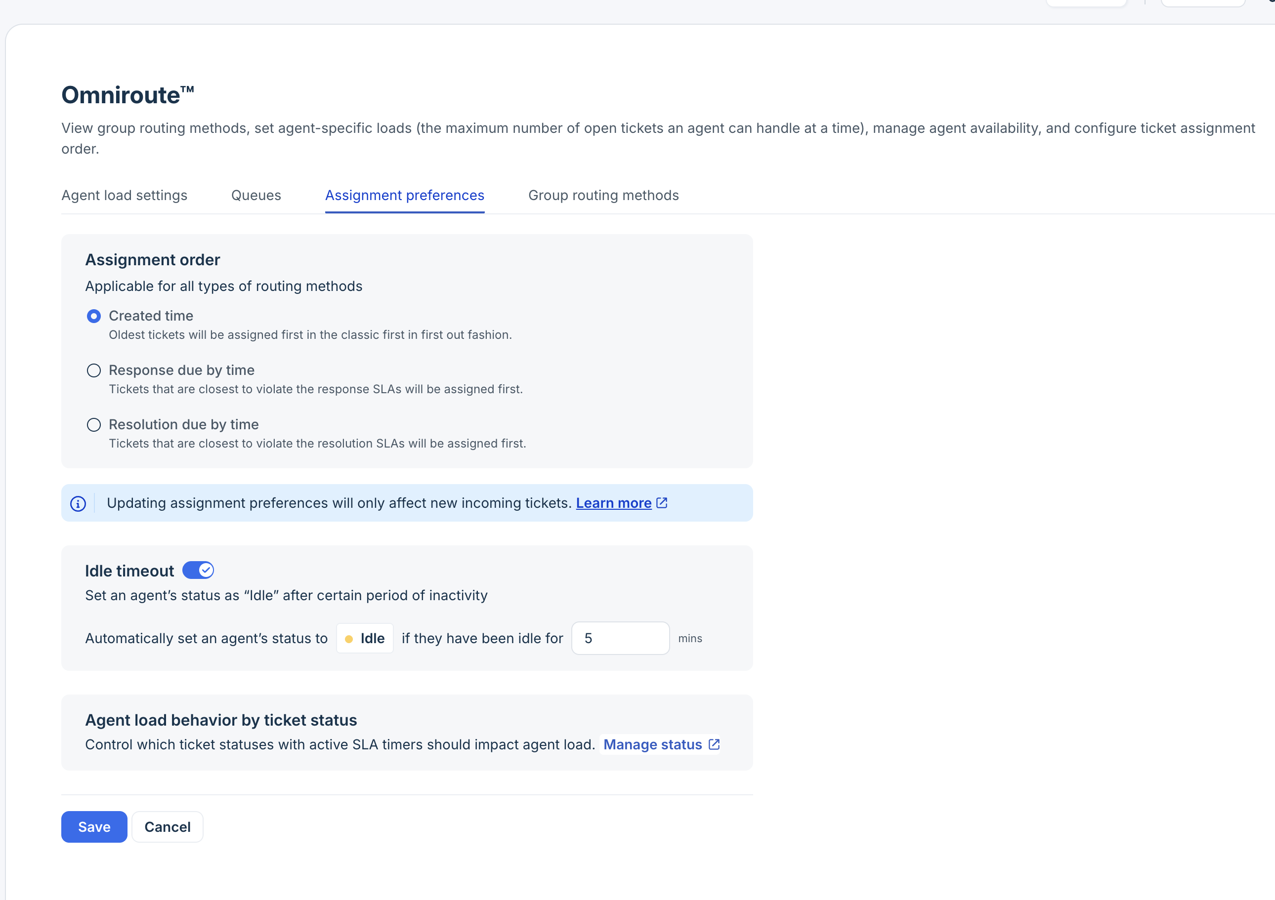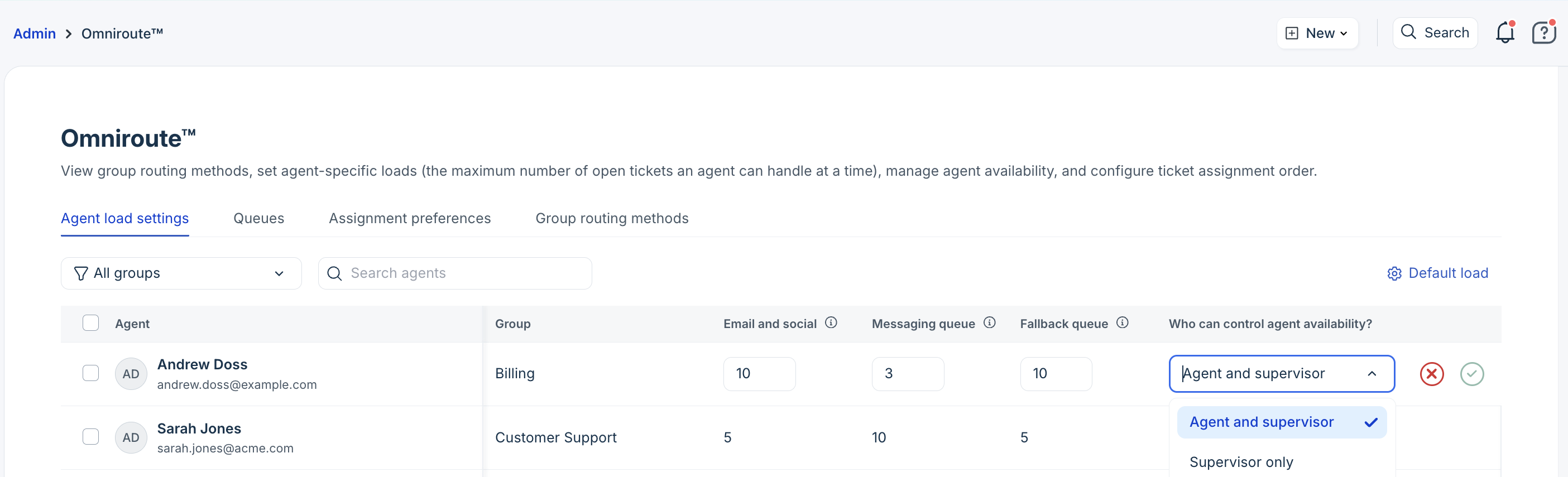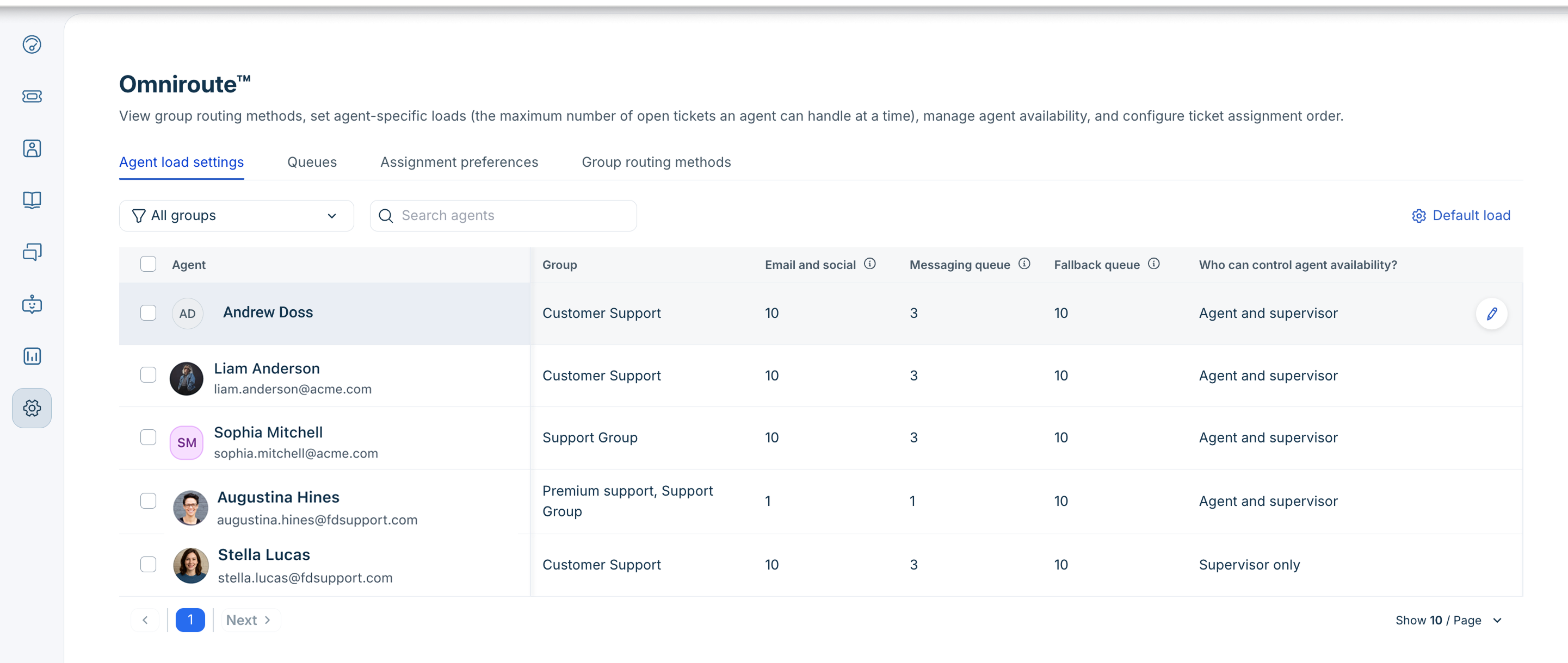 - Agent load settings: Configure ticket handling capacity for each agent.