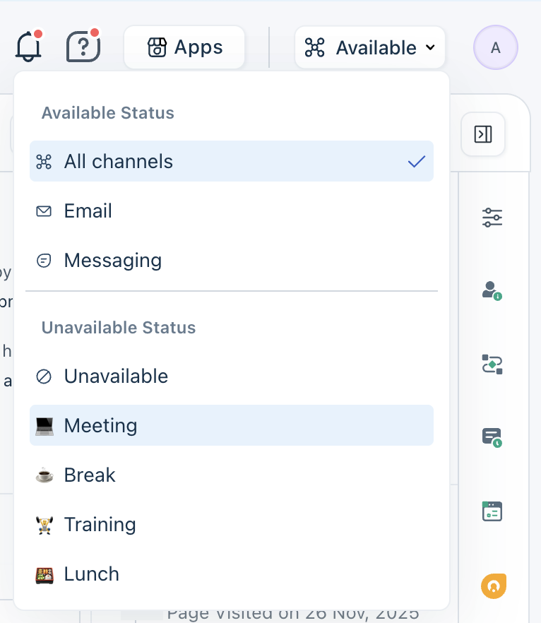 - The Availability drop-down is visible only when agent-level control is enabled. This applies to all roles, including admins and supervisors.
