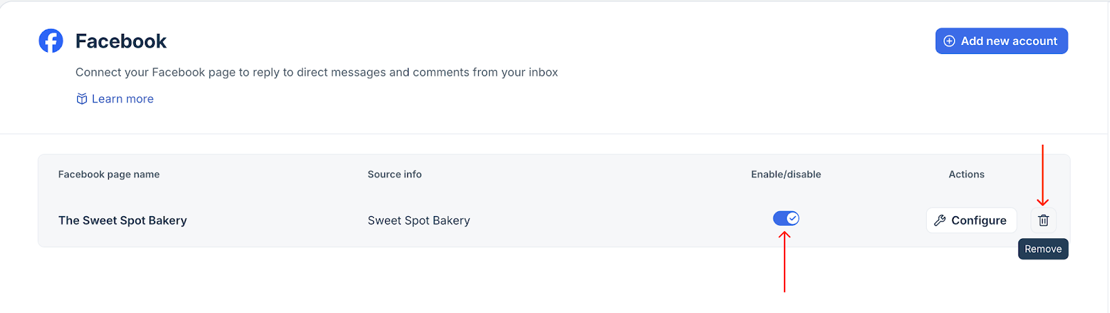 Use the enable/disable toggle in each Facebook page to temporarily stop ticket creation from the page. Re-enable anytime to resume syncing.