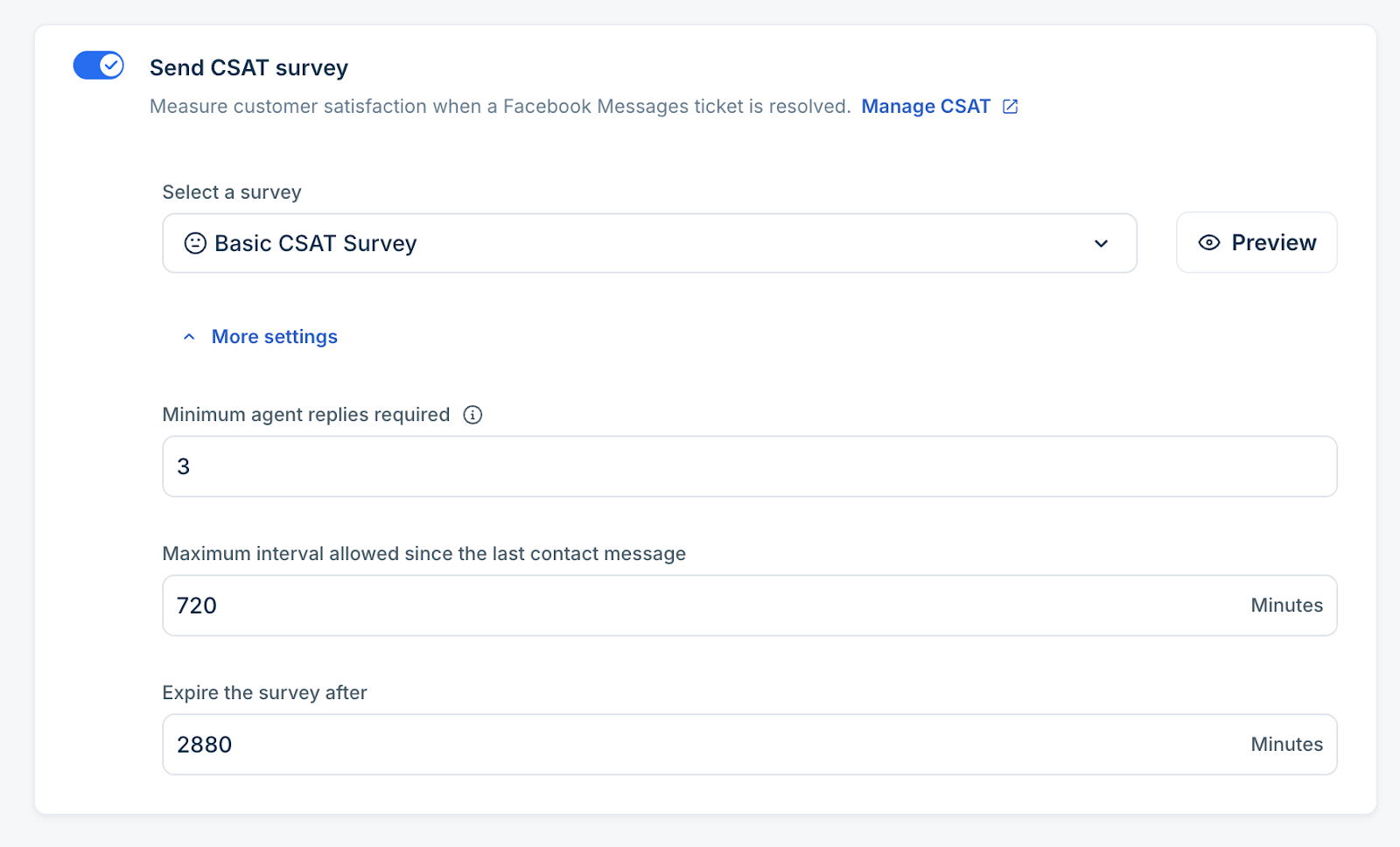 When enabled, Freshdesk automatically sends a CSAT survey after a Facebook Messages ticket is resolved. You can also configure the following settings for CSAT: