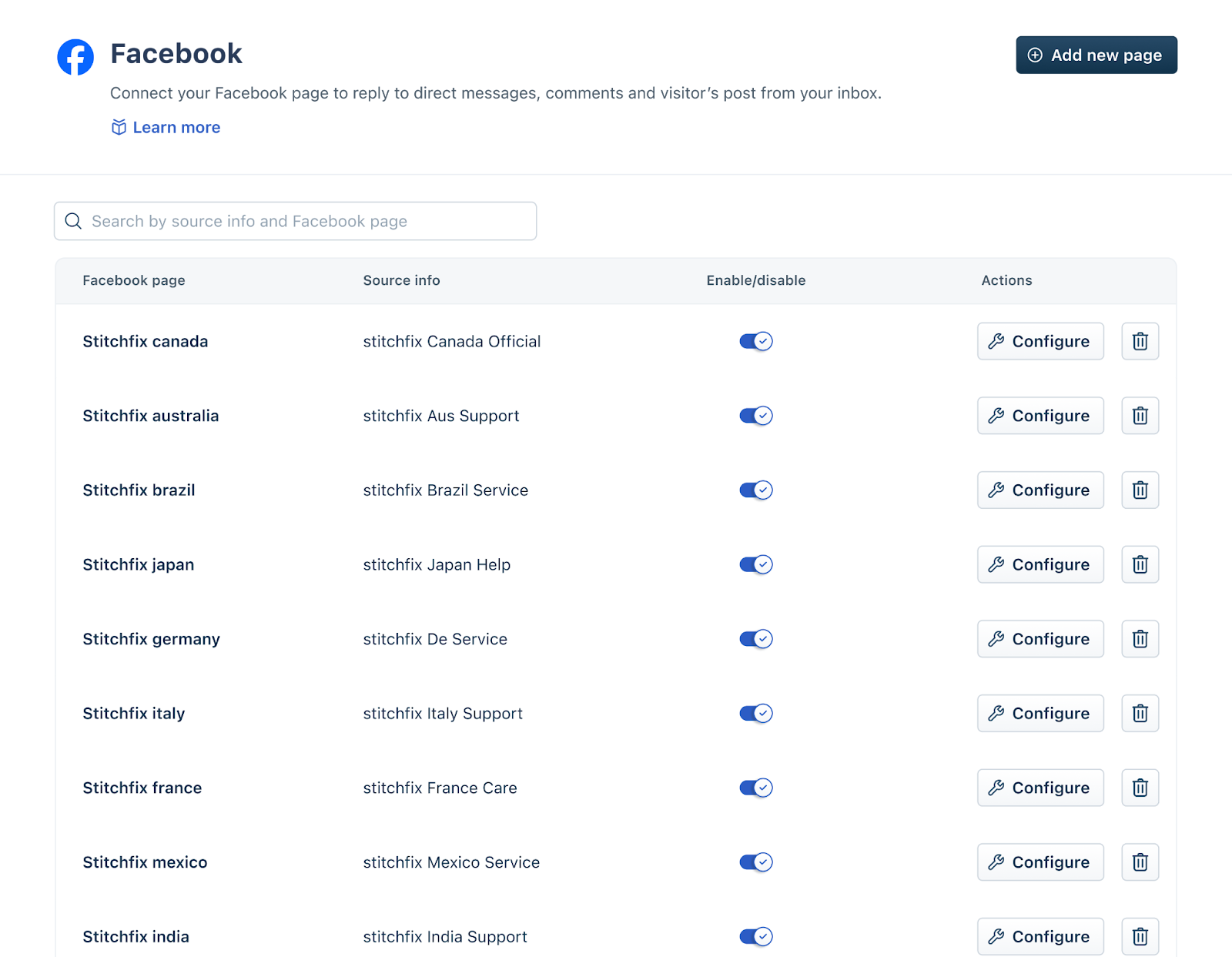Use the search bar at the top to easily search connected Facebook Pages by name. Search would be available if any account has more than 8 pages connected.