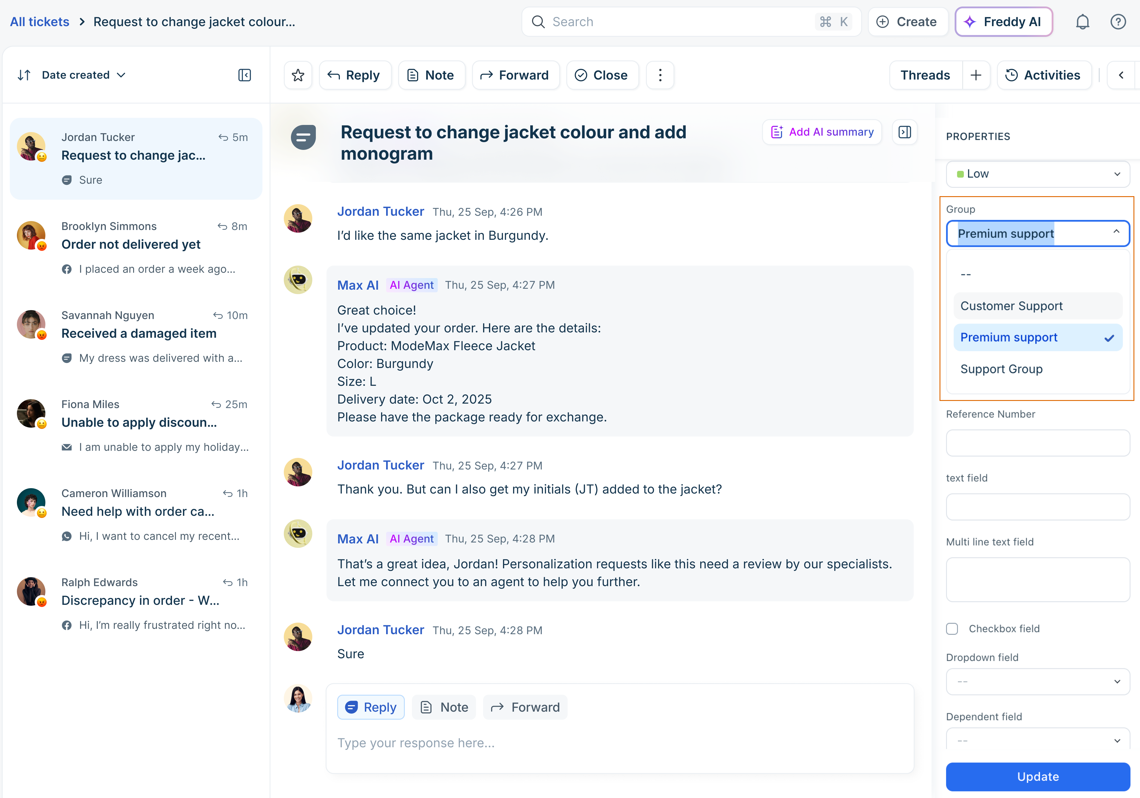 - Assign tickets: Tickets can be assigned to groups. This filters the list of assignable agents to those in the chosen group.