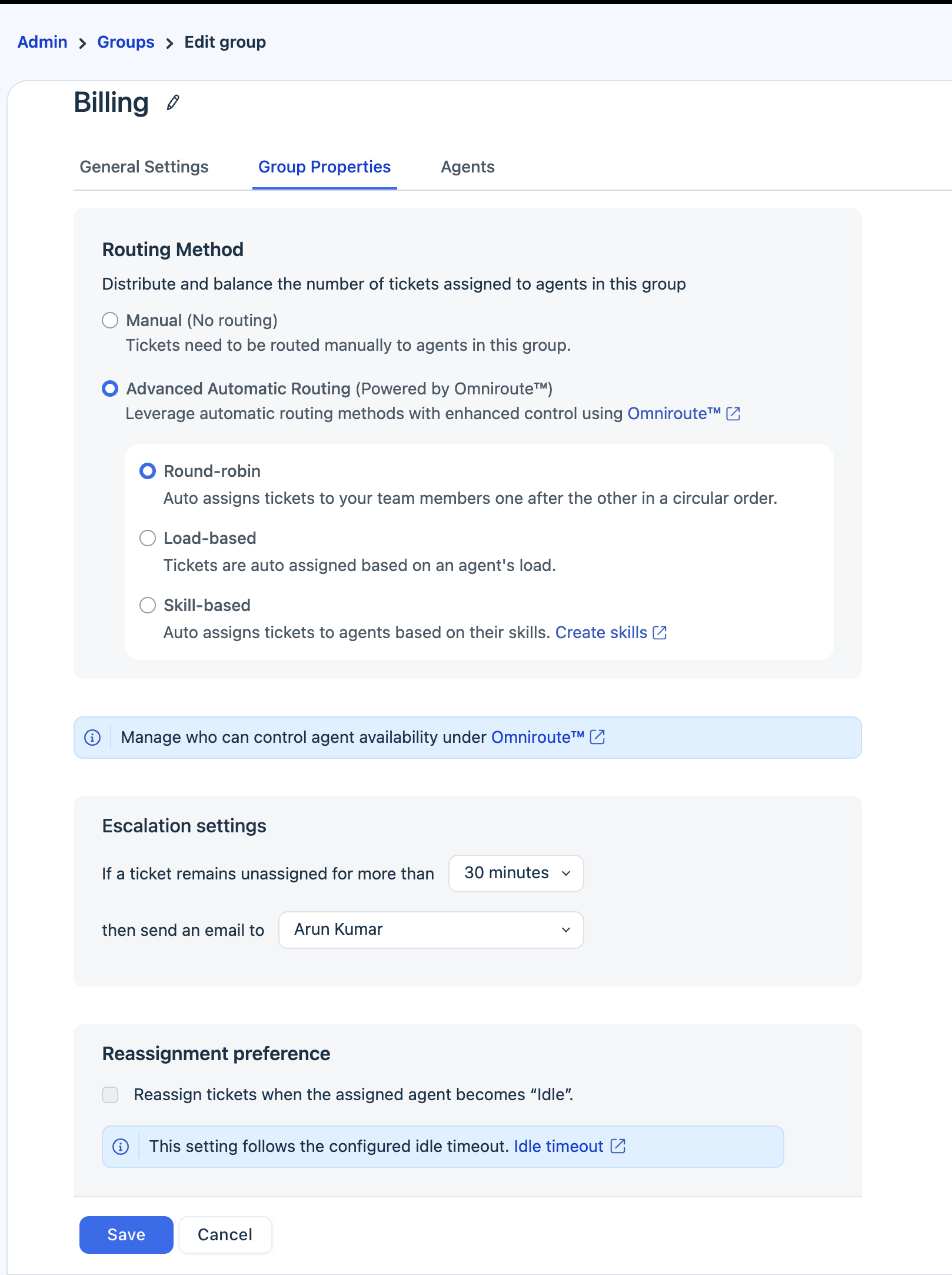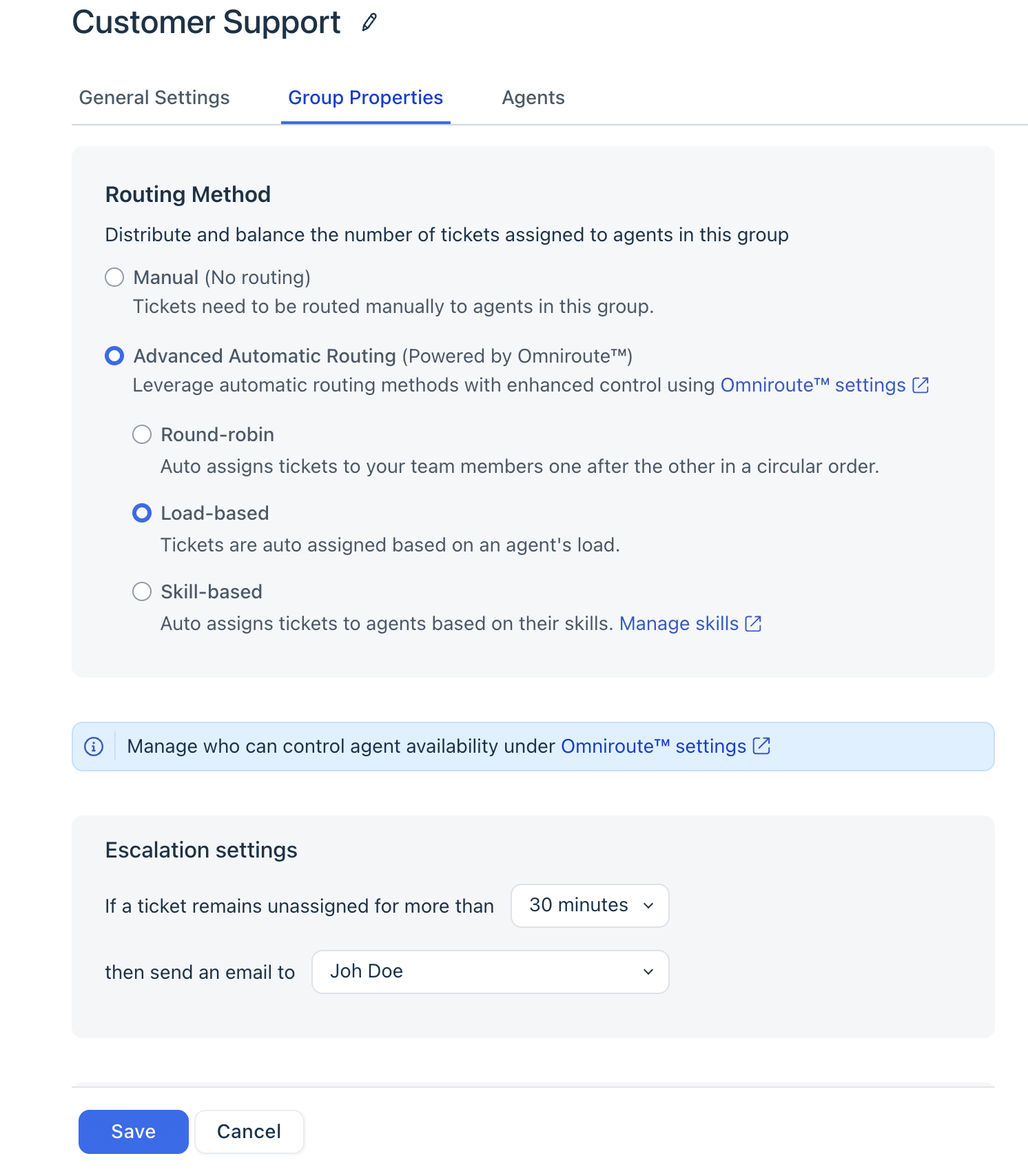 - Ticket Routing: Enable manual or automatic routing for tickets in the group.