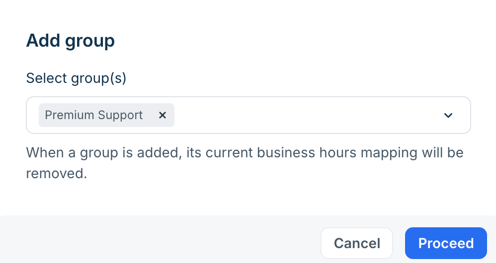 2. In the Add groups pop-up, you can select the group to which you want to assign the business hours.