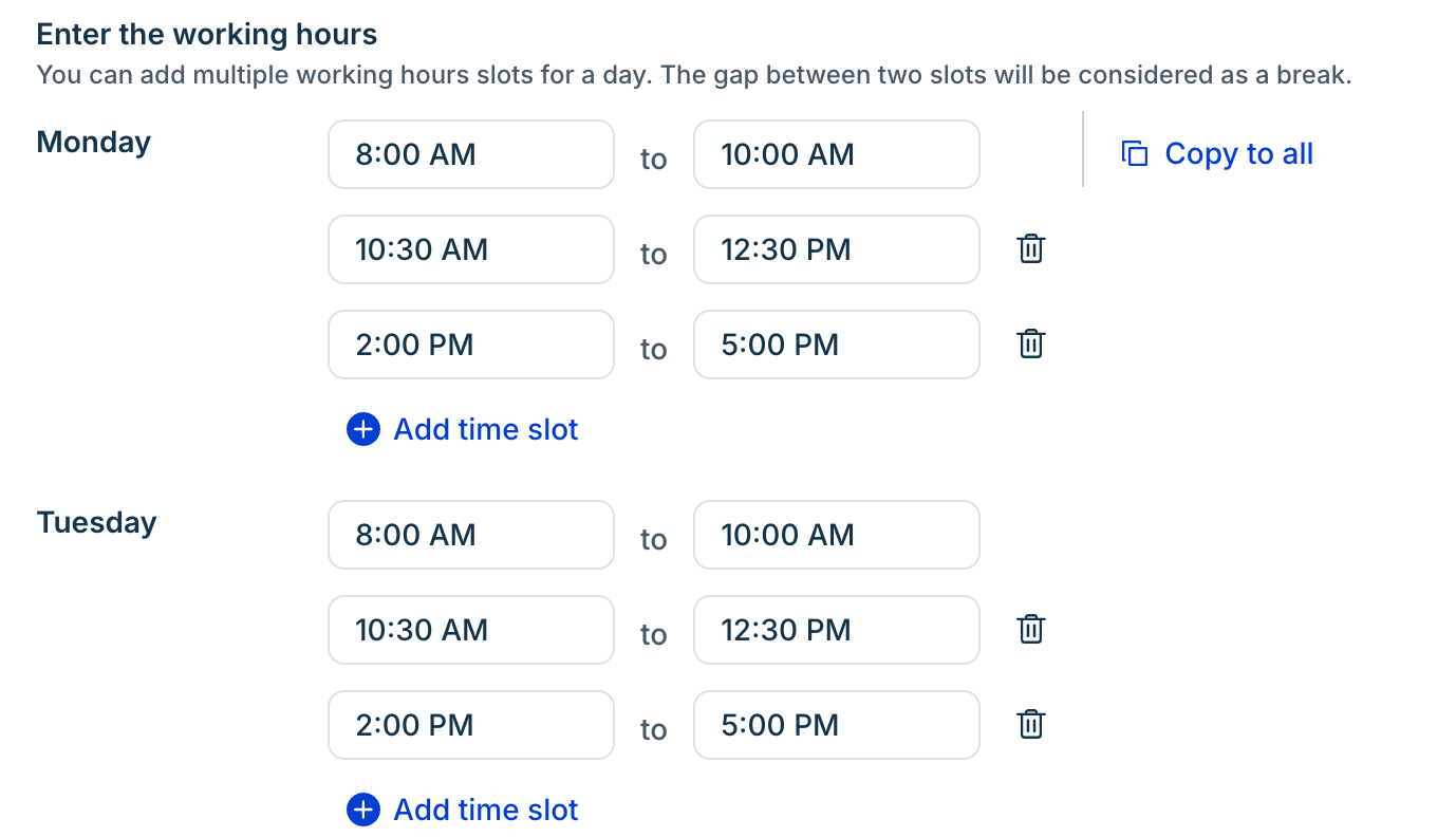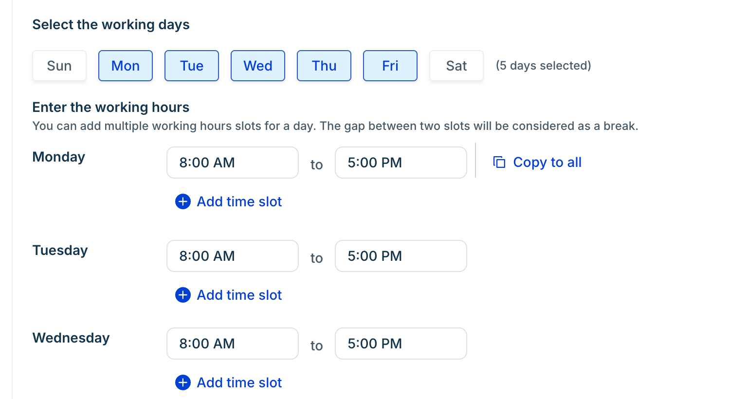 1. You can also add multiple working slots for a day. The gap between two slots will be considered as a break. You can add up to 5 breaks for a day.