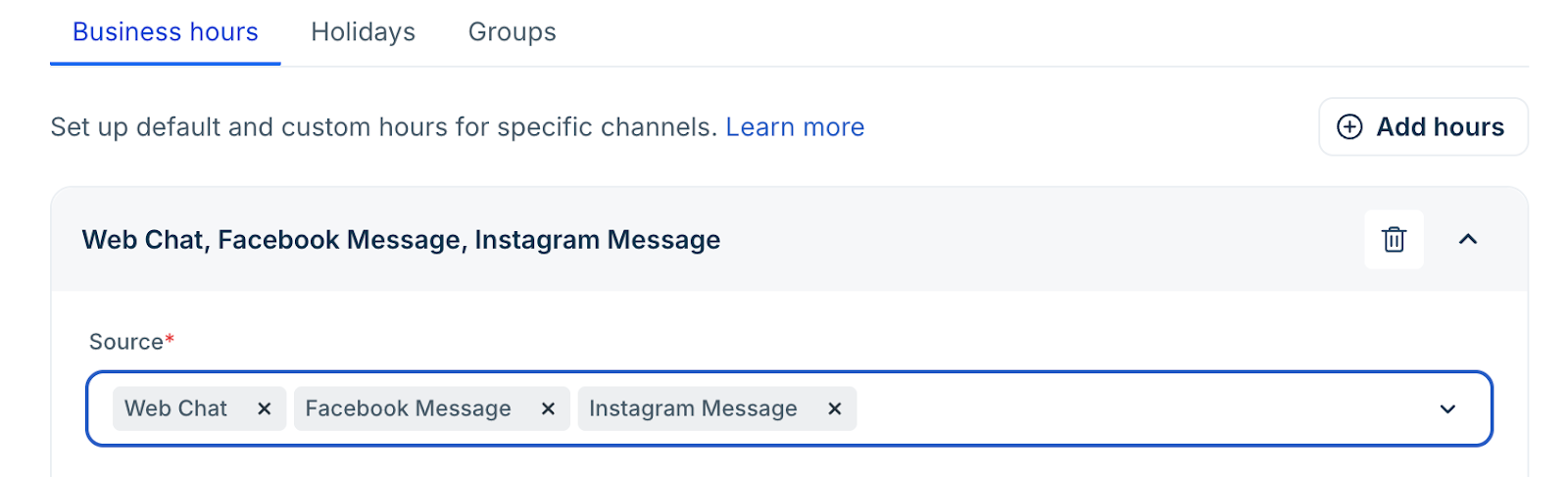 2. Select the sources for which you want to configure business hours. This is available only for Freshdesk Omni. In Freshdesk, a single set of business hours applies to all channels.