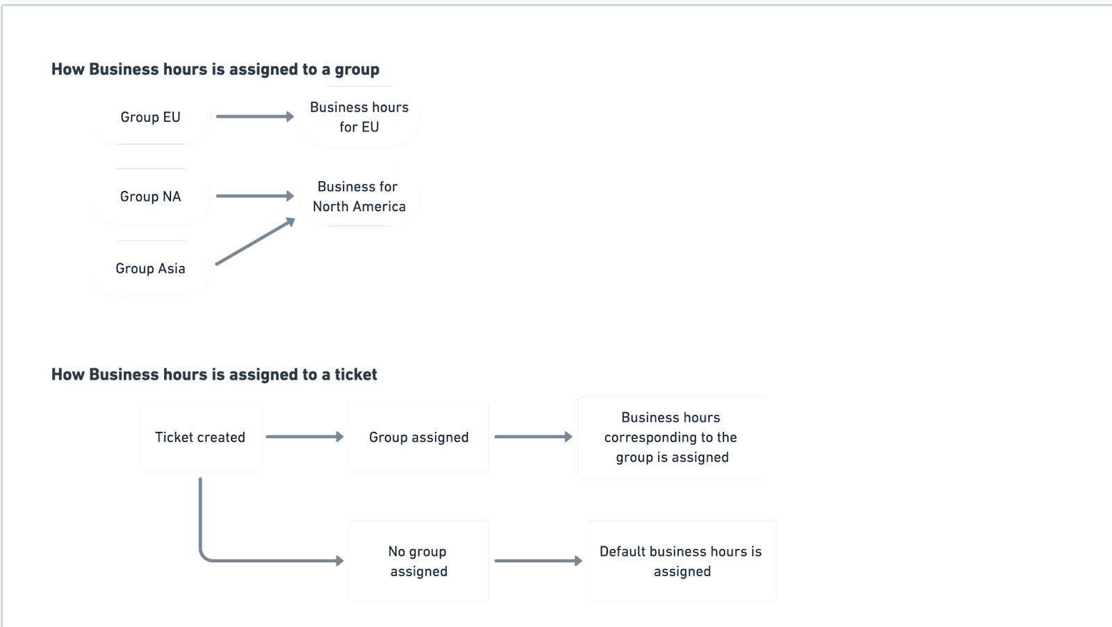 Business hours in Freshdesk cannot be applied to tickets unless they are first mapped to a group. Each group can be assigned its own business hours (for example, EU, North America, or Asia), ensuring that SLA calculations match the team’s actual working schedule. When a ticket is created, Freshdesk checks which group it belongs to. If the ticket is assigned to a group, it automatically inherits that group’s business hours. If no group is assigned, the ticket defaults to the business hours. This setup ensures accurate, region-specific SLA tracking without any manual effort.