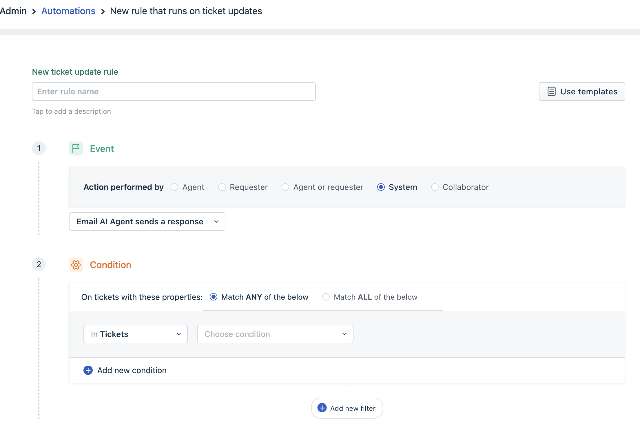 - Admins can optionally create automations to flag tickets that were handled by the Email AI Agent for reporting, QA, or tagging purposes.
