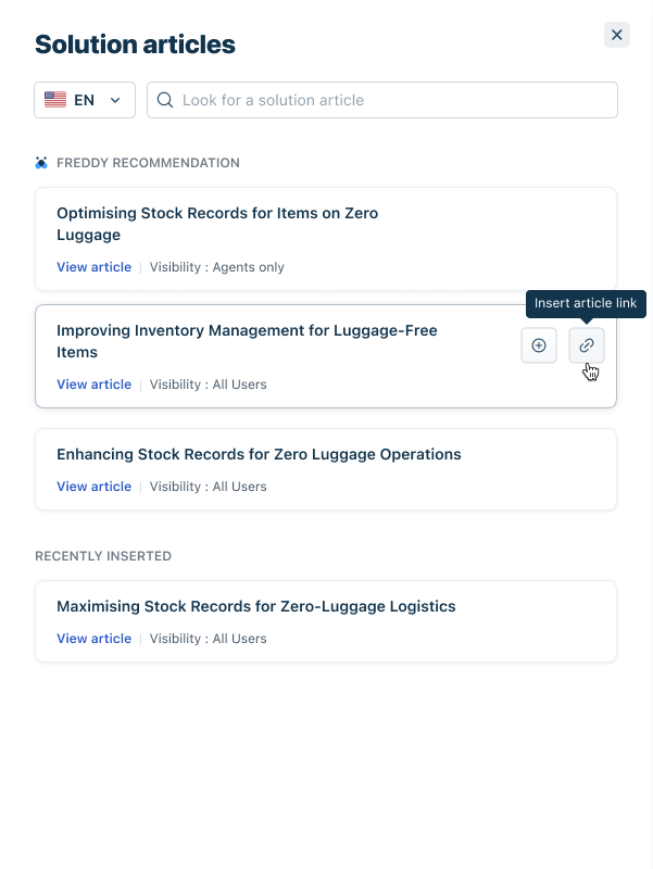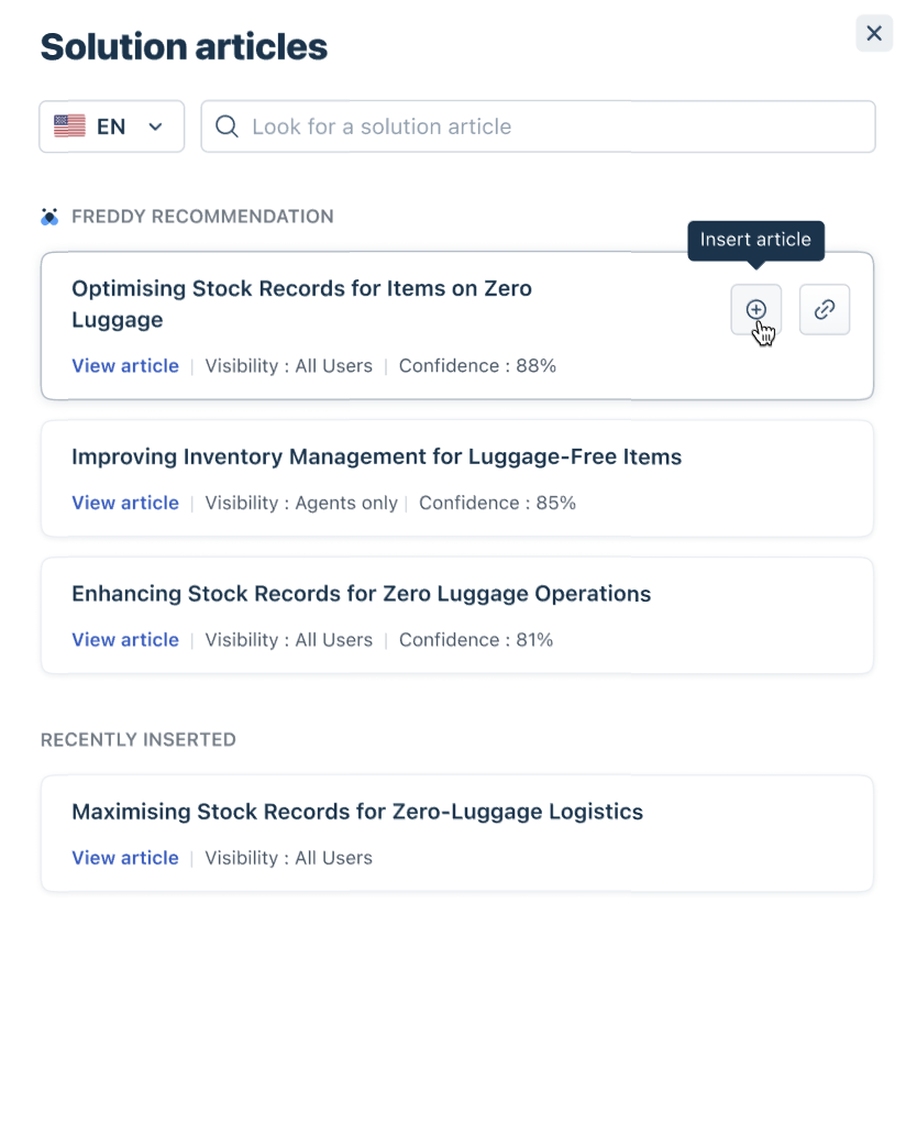 - You can select the solution article of your choice from the Freddy recommendations and insert it by clicking on it