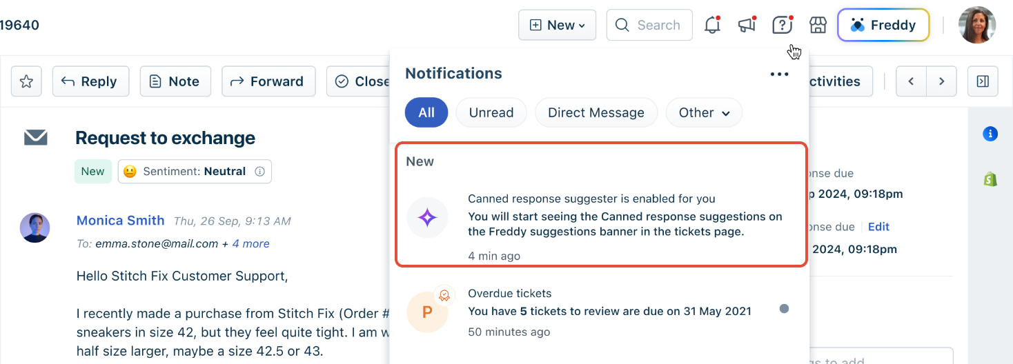 This article explains how to enable and use Freddy AI–recommended canned responses when replying to customer tickets.