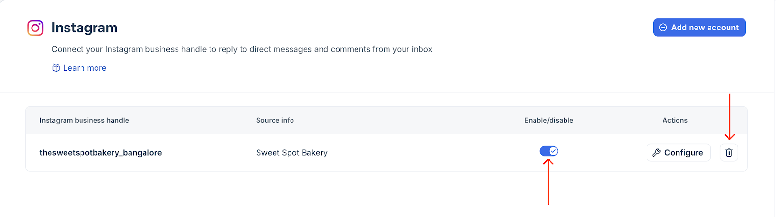 To disconnect an Instagram page, click the bin icon next to it. Deleting a page stops all data syncing, removes the current configuration, and unlinks it from the list. If you want to reconnect the page later, you will need to add it again.