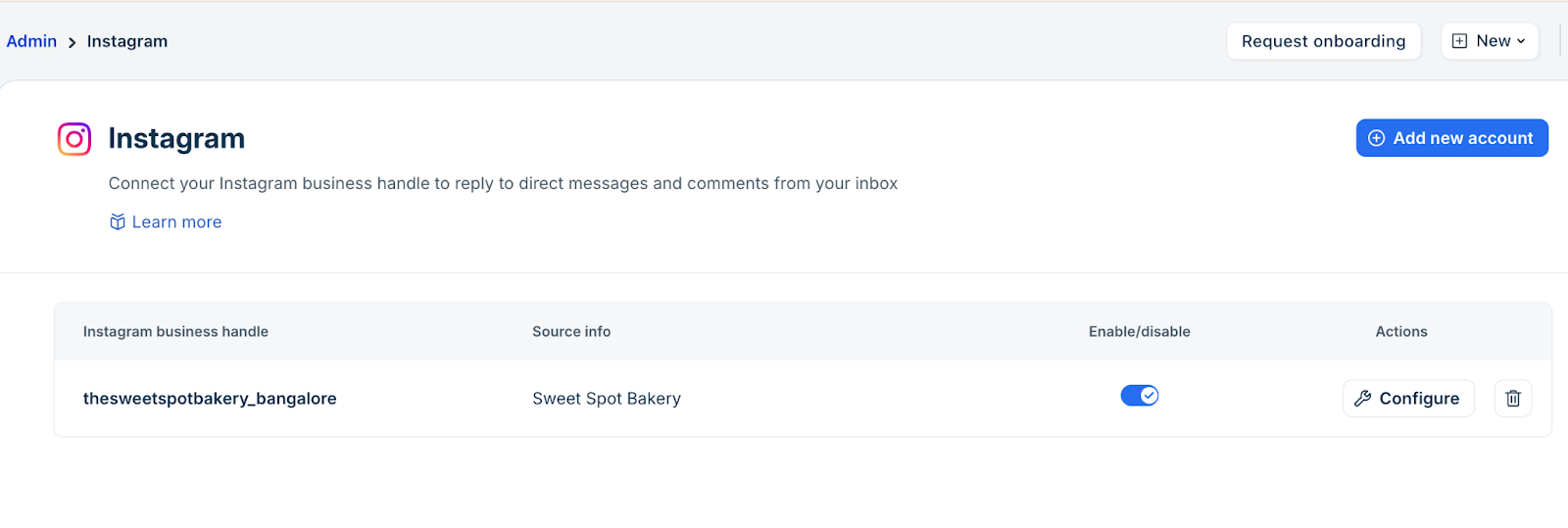 After connecting, admins can manage pages from the Instagram list page using the following actions: