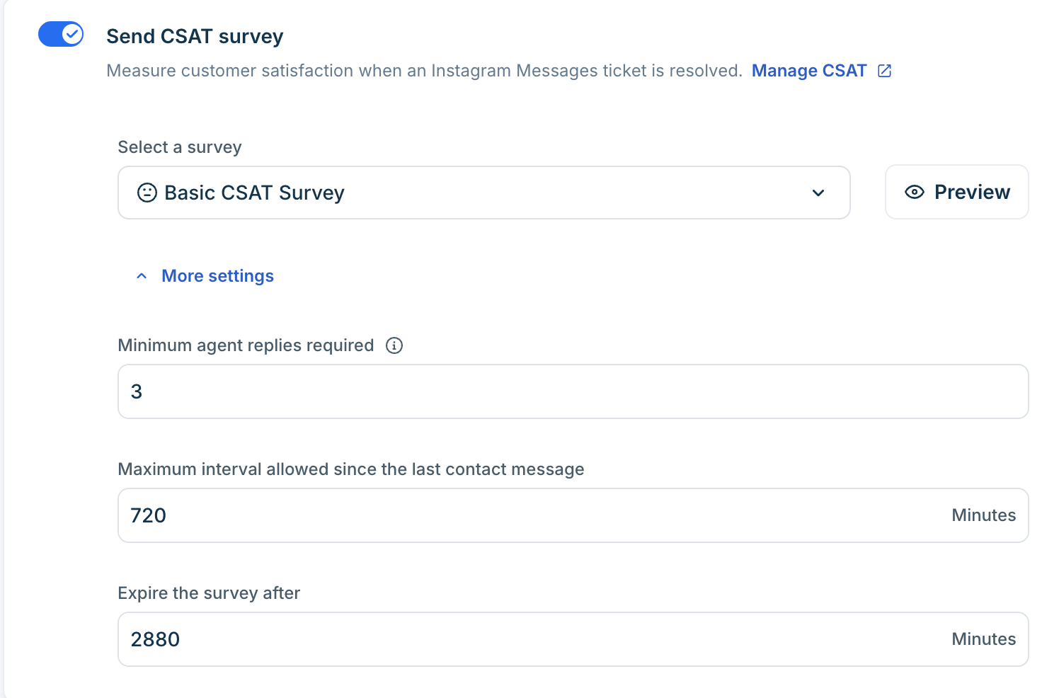 1. Minimum messages required to trigger survey -The least number of messages exchanged in a conversation before a survey is sent.