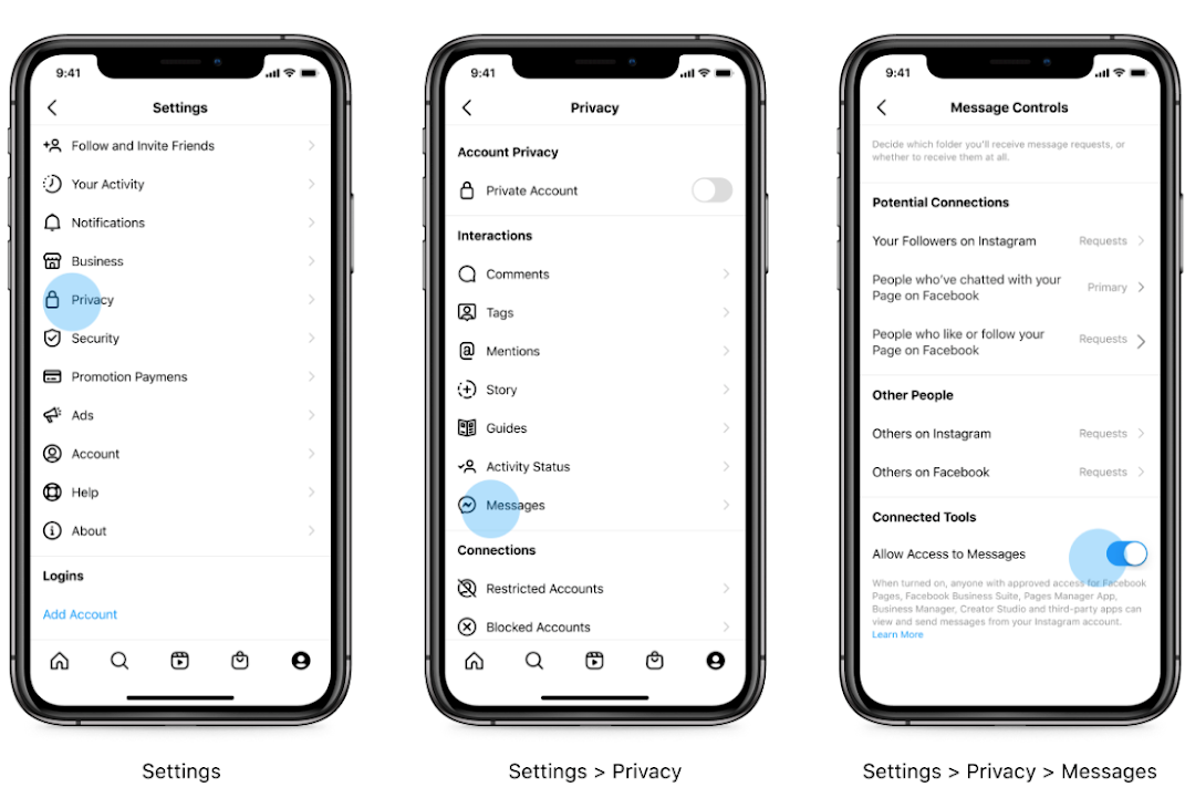 To manage Instagram messages via API, enable the Connected Tools option to allow access to messages.