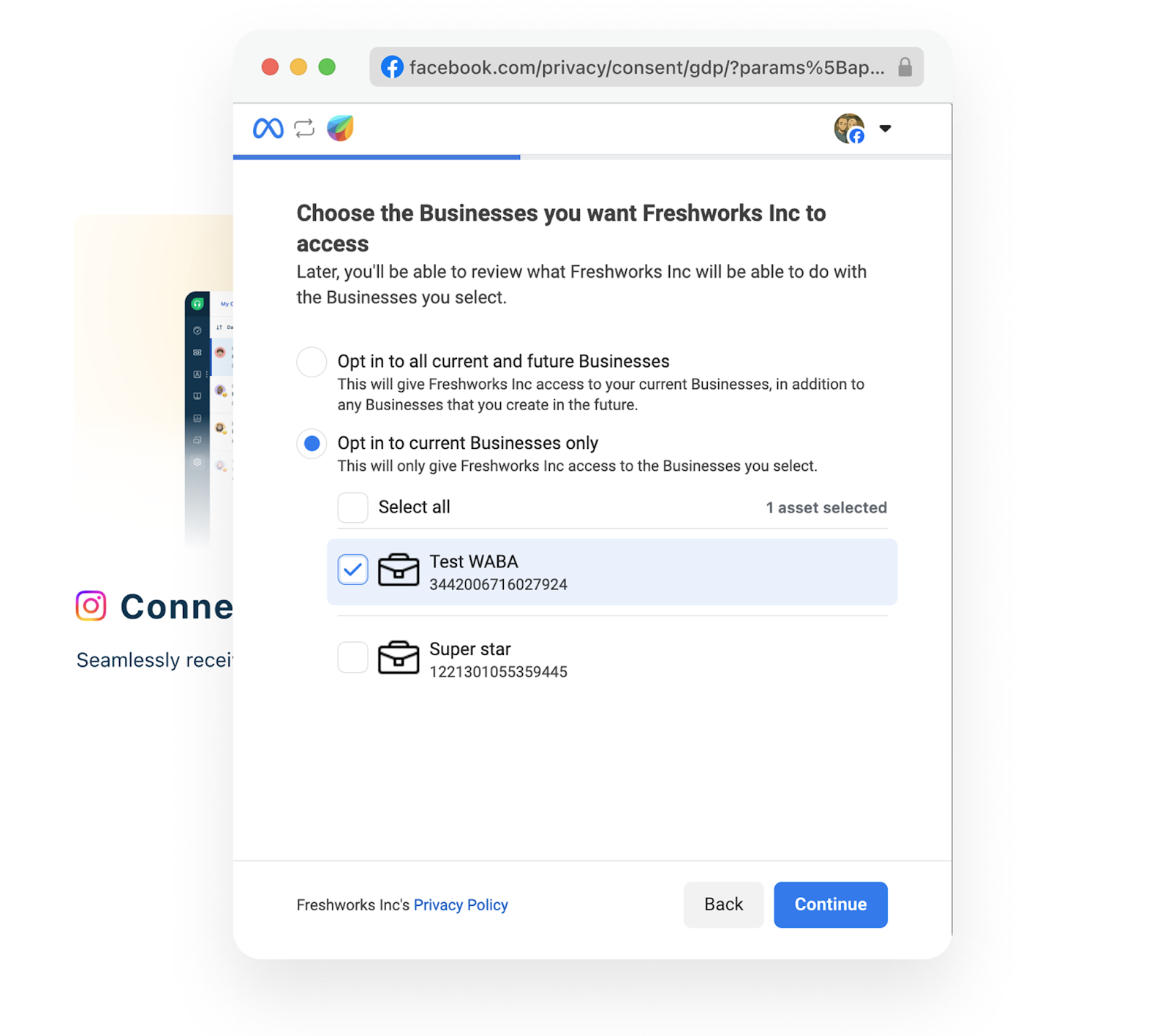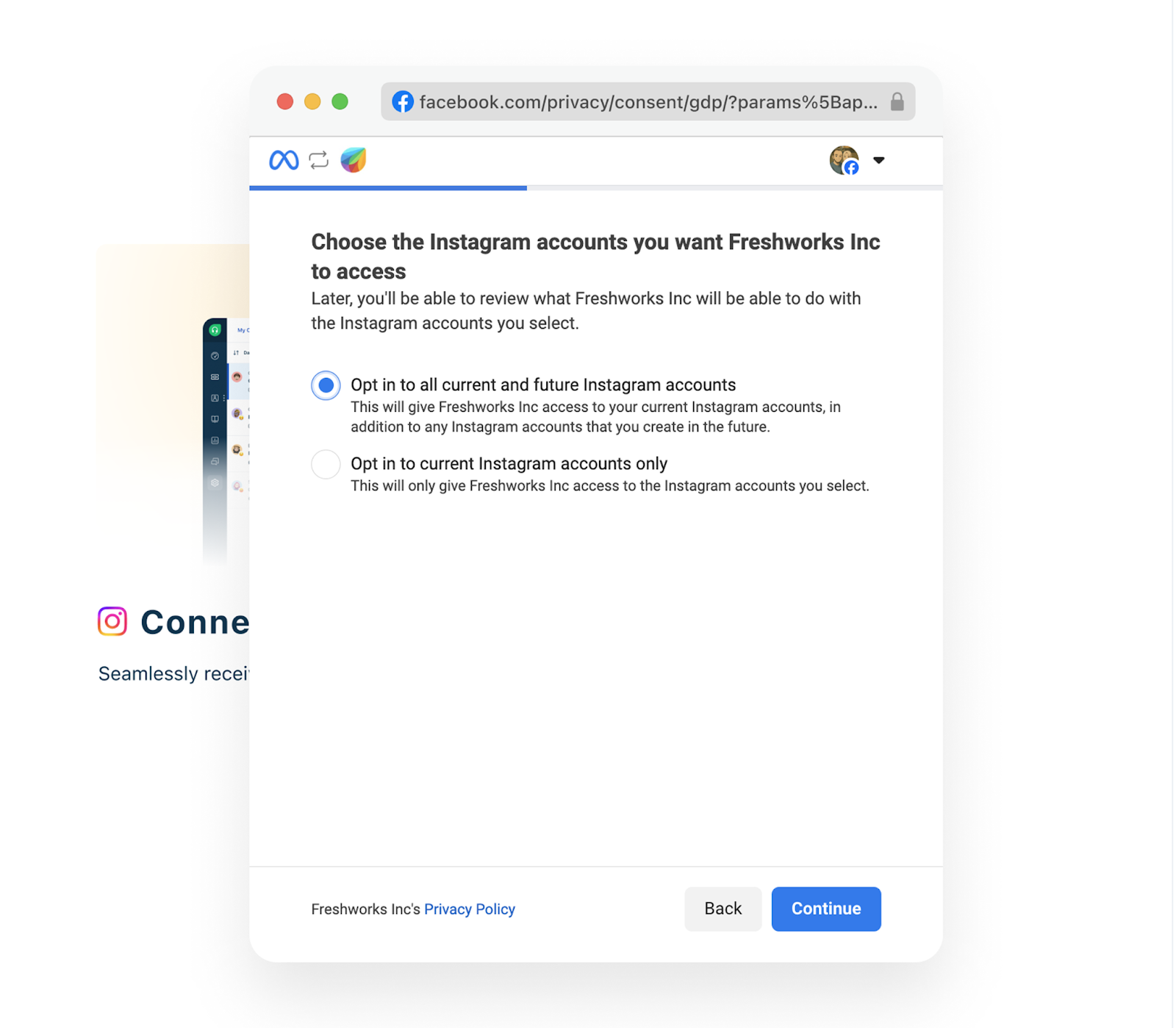 1. Select the Instagram Business accounts you want to connect with Freshdesk Omni and click Continue. You can select up to 50 accounts.
