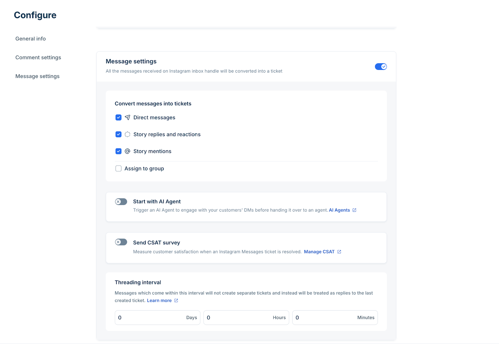 Note: AI agent, threading Interval, and CSAT are applicable only to Instagram messages and not Instagram Comments.