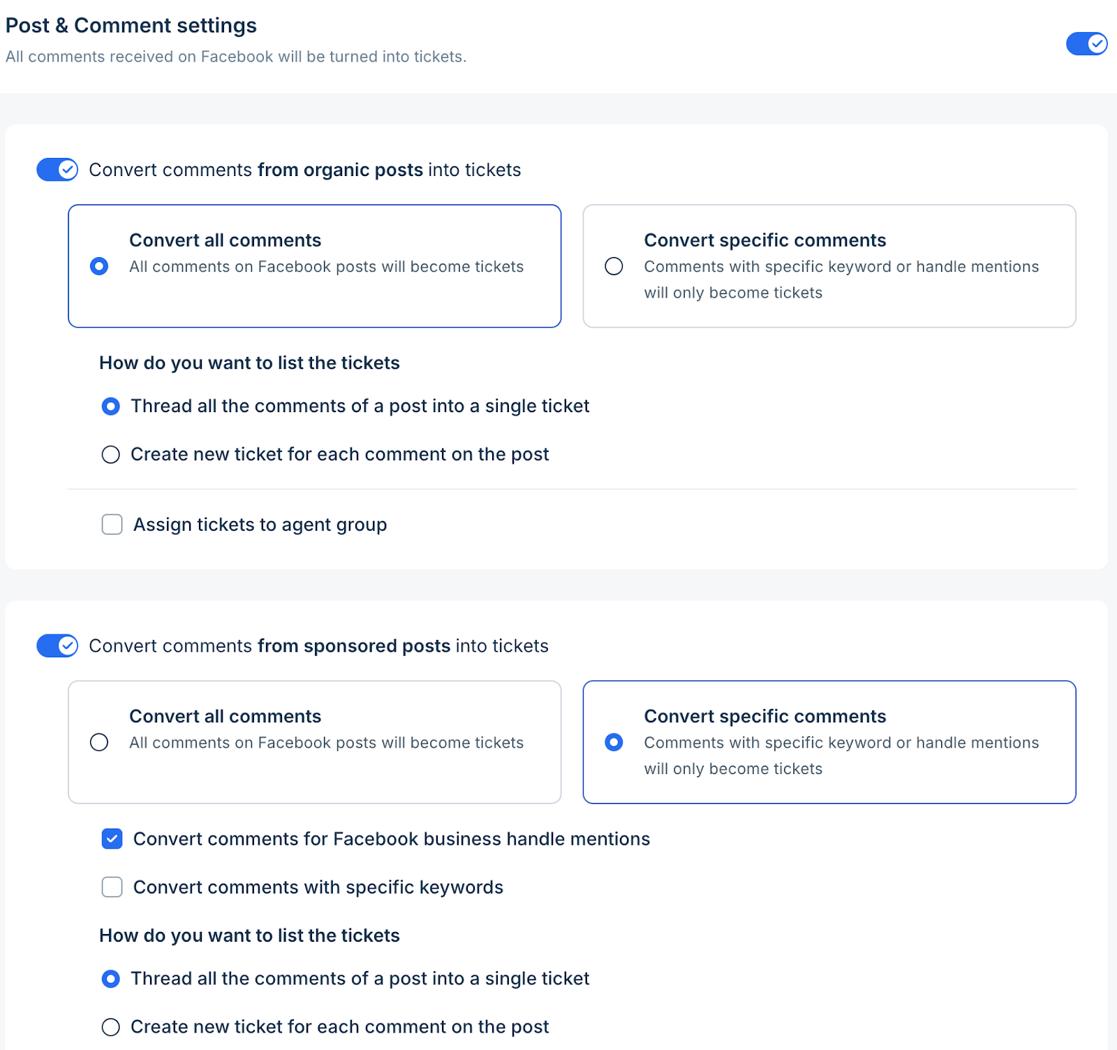 You can control what becomes a ticket and how comments should be organized for both organic and sponsored posts. You get two modes: