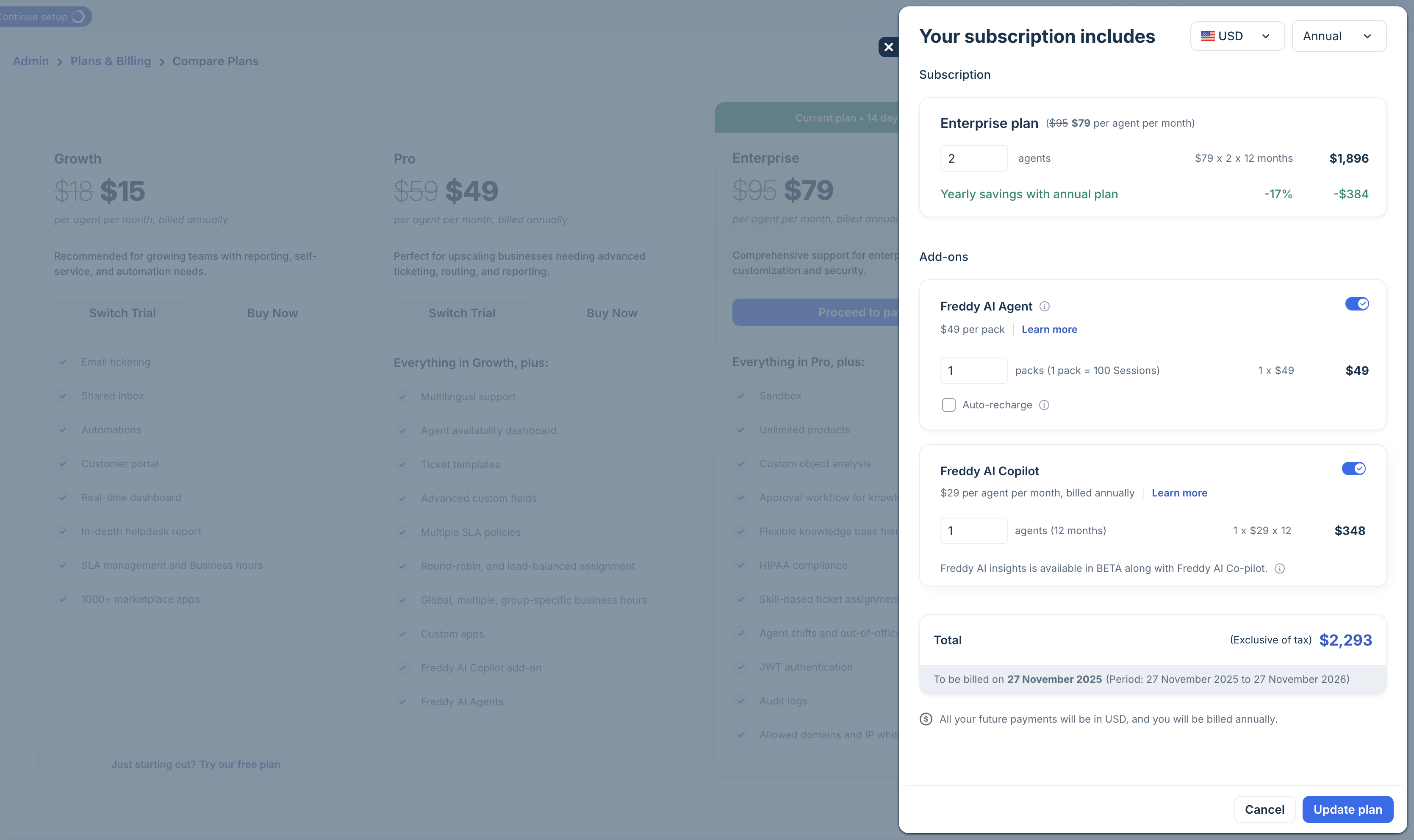 Note: For new customers, we provide a one-time complimentary 500 Freddy AI Agent sessions with the purchase of Growth, Pro, or Enterprise plan. Once exhausted, you can purchase Freddy AI Agent session packs as an add-on.