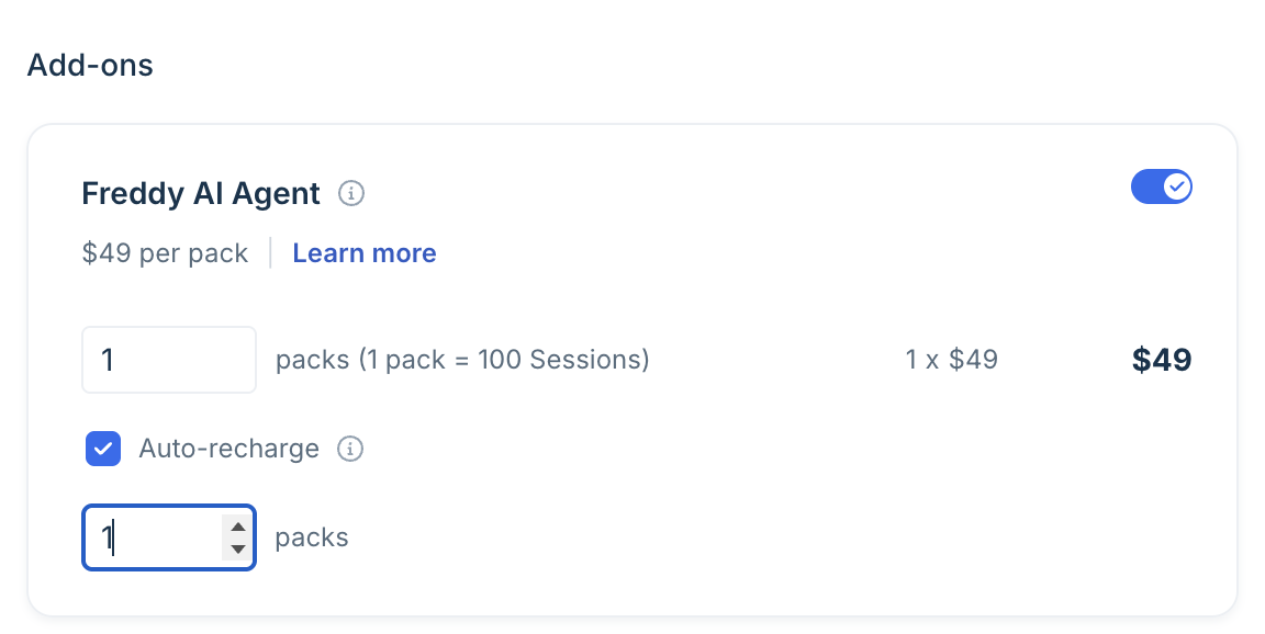 The Freddy AI Agent add-on enables you to deploy AI Agents that provide instant, contextual assistance to customers. Each session includes all interactions between an end-user and the AI agent within a 24-hour window. A single pack contains 100 sessions and costs $100.- Sessions are automatically added to your account for the current billing cycle upon purchase.