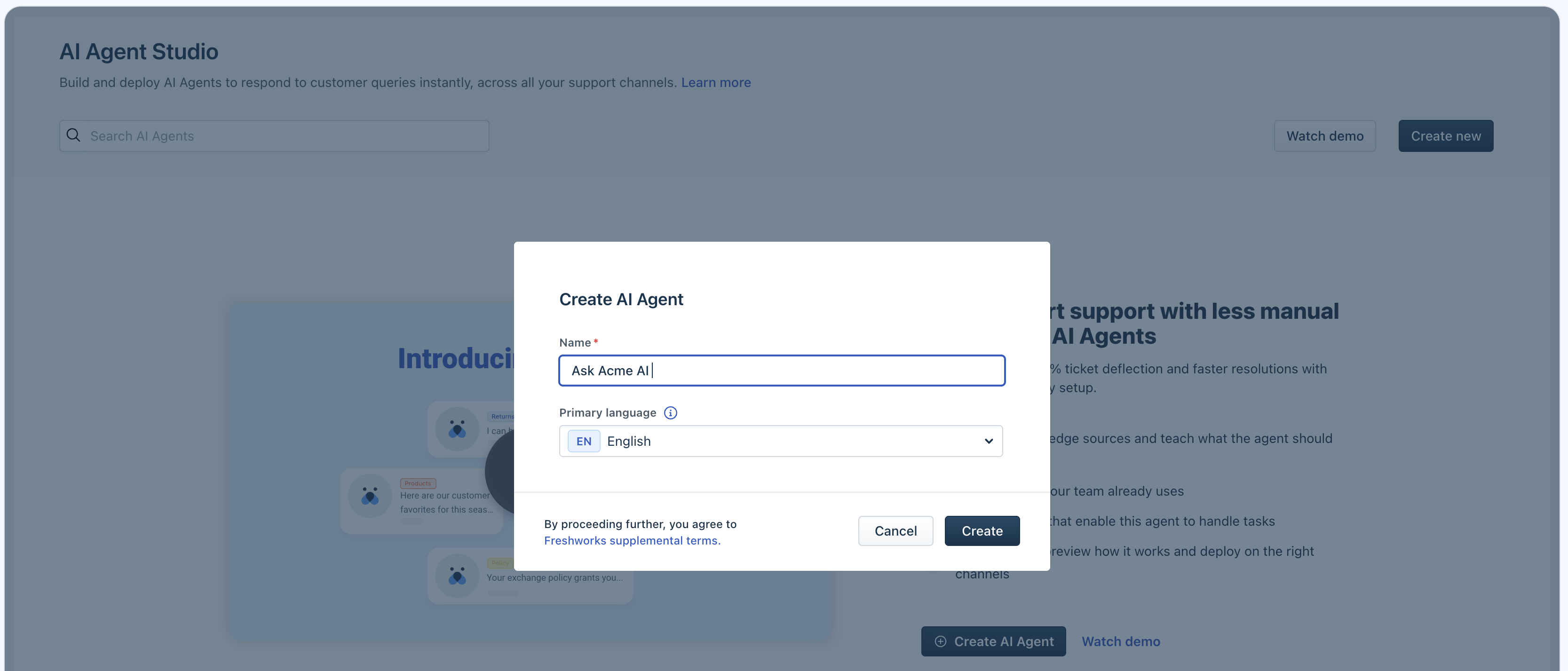 You can deploy AI Agents across multiple channels like WhatsApp, Web Chat, Facebook, and Instagram (available only in Freshdesk Omni), so customers can get help wherever they are.
