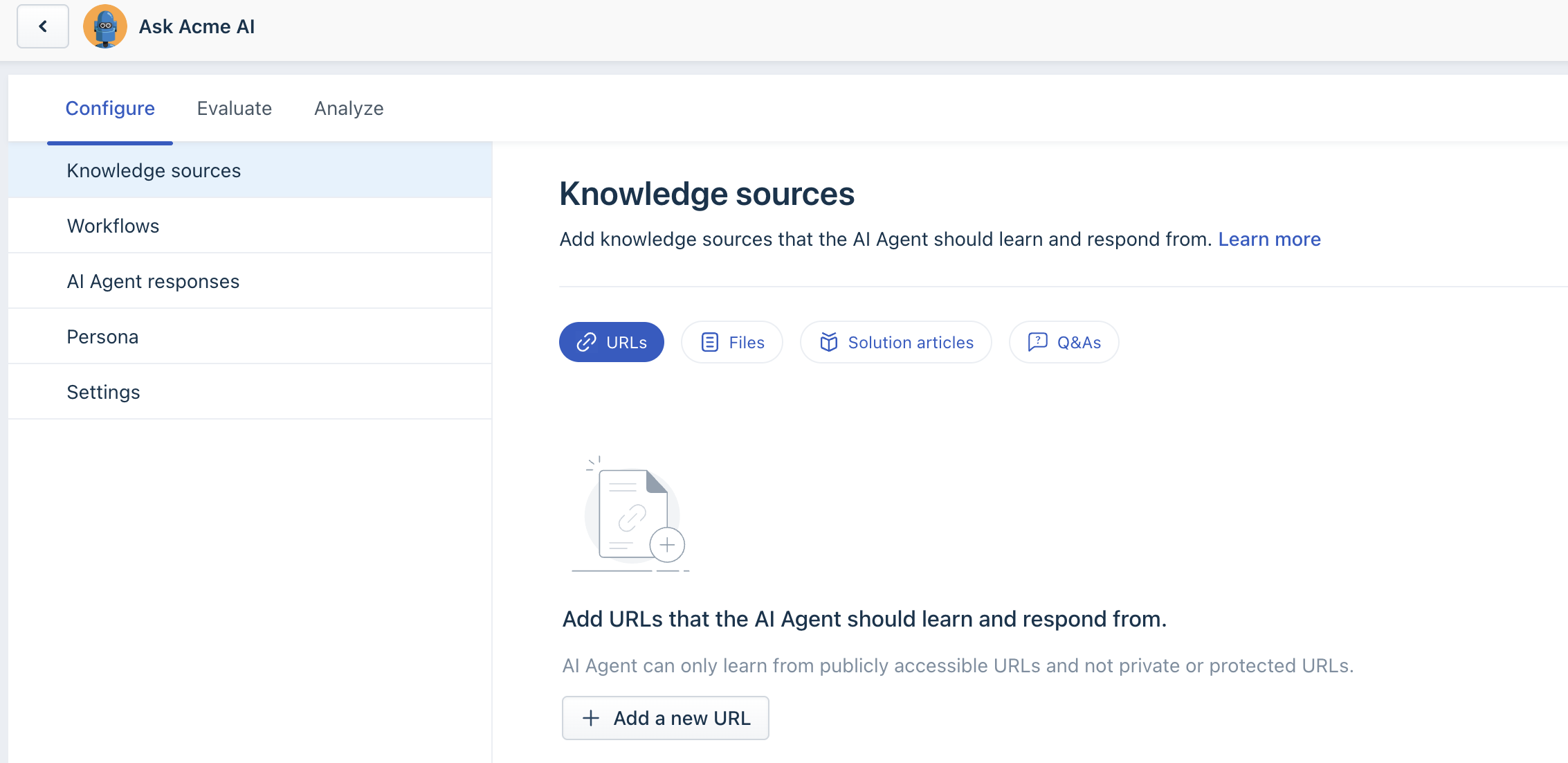 Add the knowledge sources from which you want the AI Agent to learn.You can add PDFs, URLs, FAQs, and custom Q&As. For more information, see Configure Knowledge Sources. - Configure Workflows