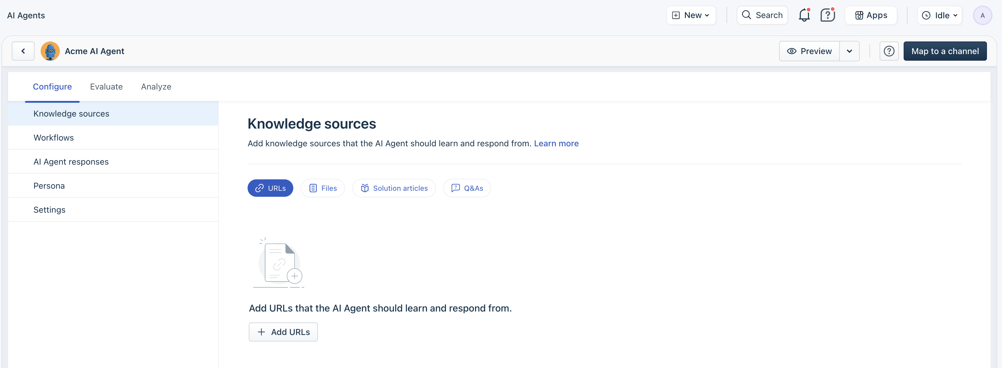 - Configure AI Agent knowledge sources, workflows, and responses