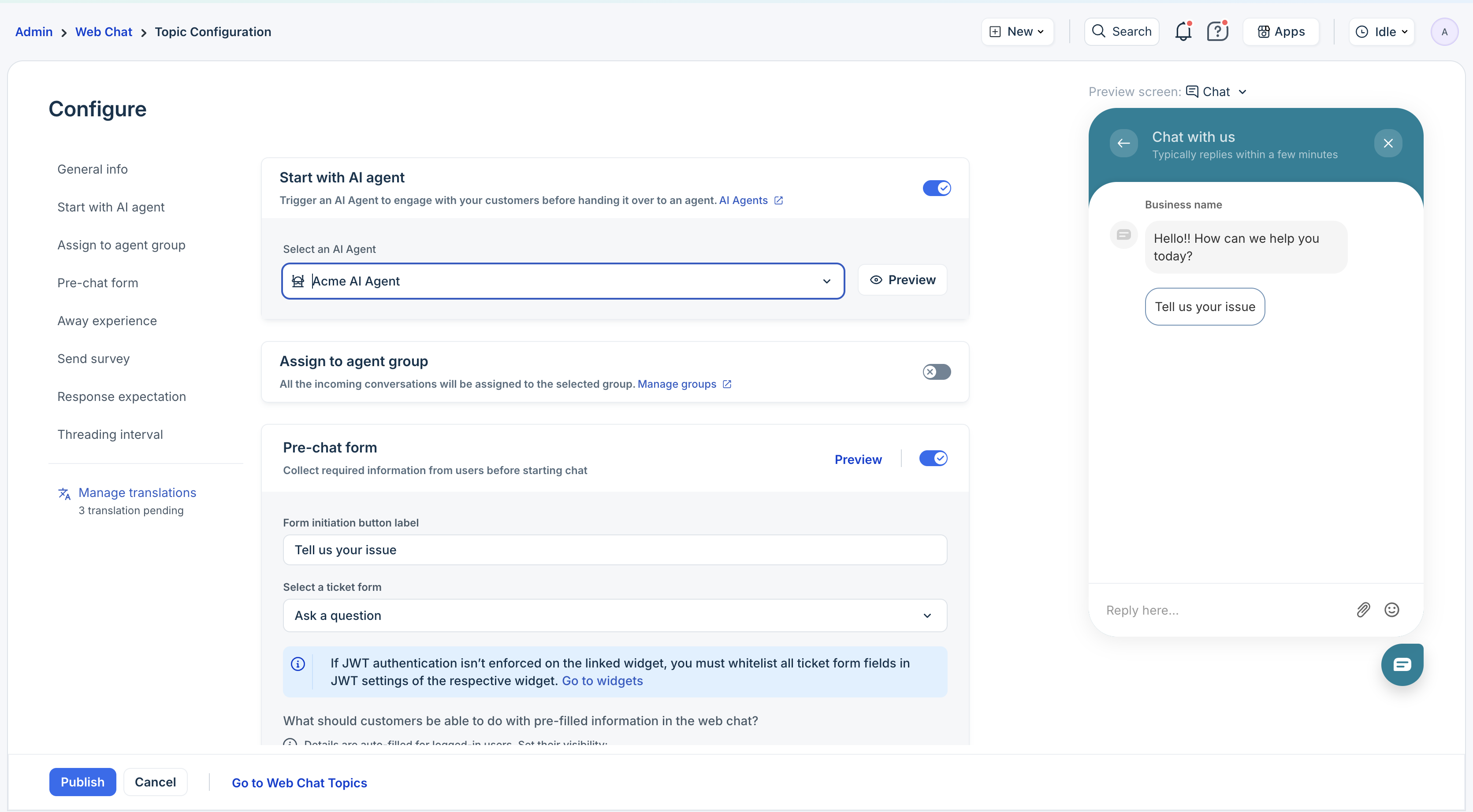 For example, if you choose Web Chat, you will be redirected to the Web Chat Topic Configuration page.
