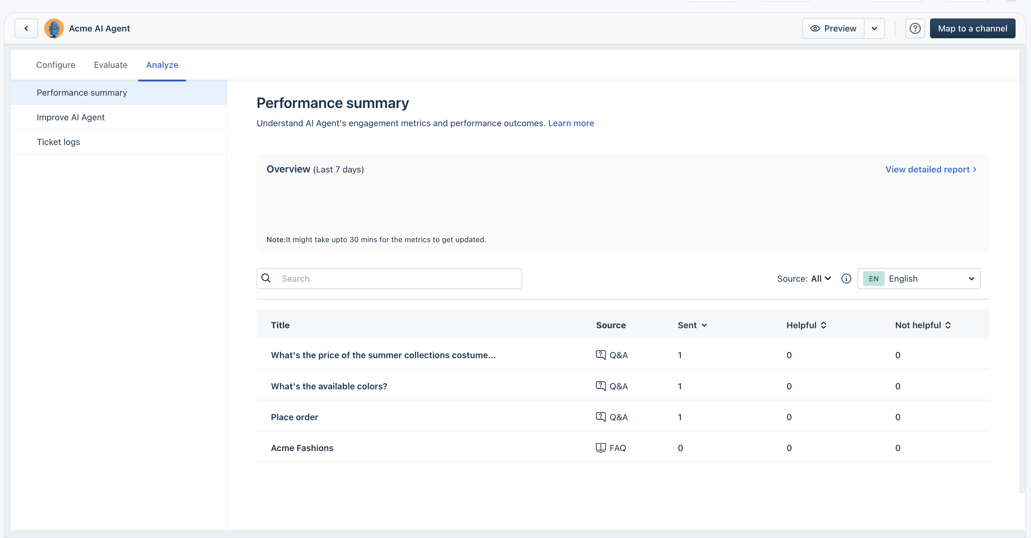 Track and improve your AI Agent’s performance using the Analyze tab.