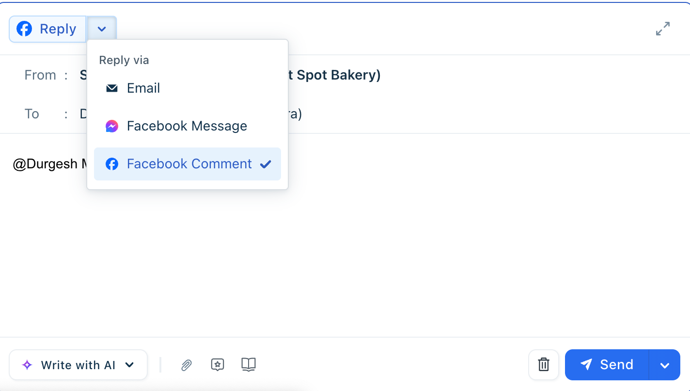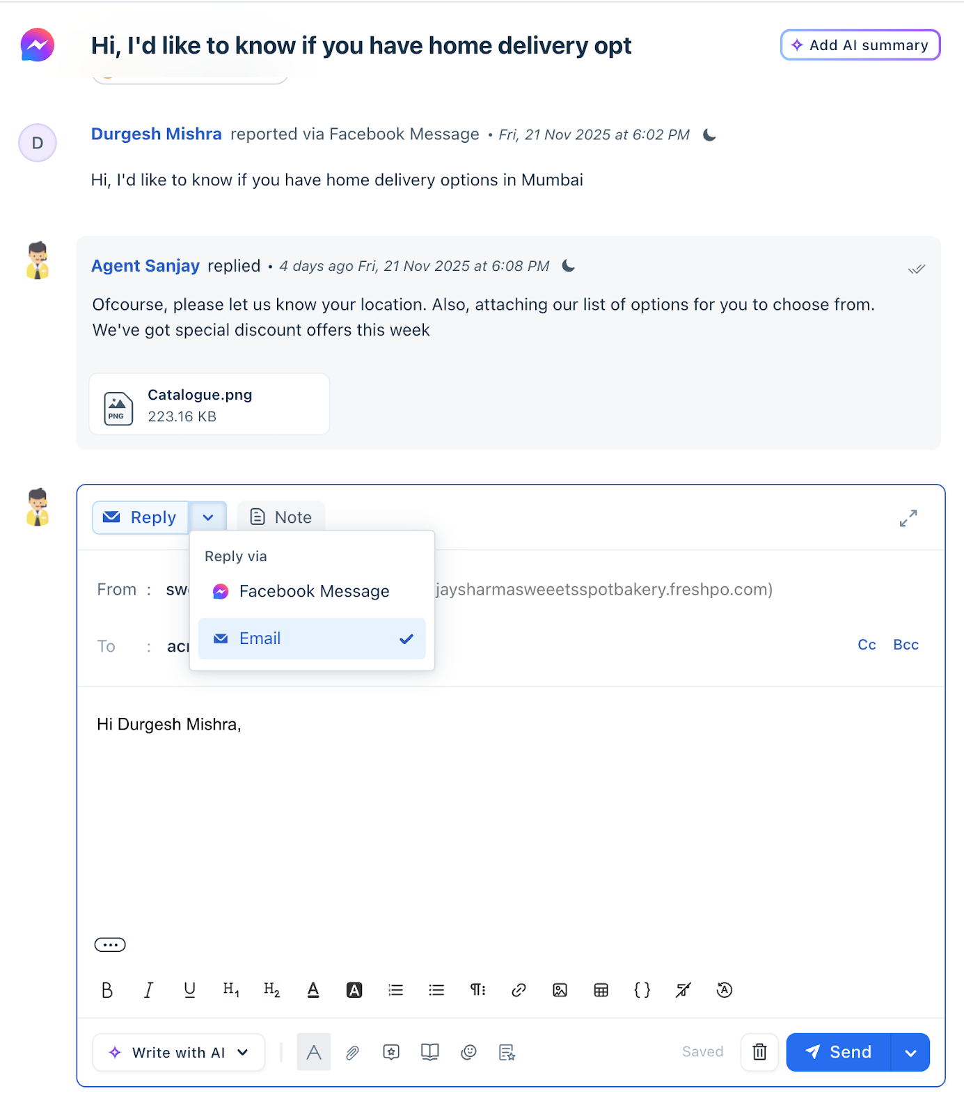 Agents can choose to reply to a Facebook comment through email when a contact has a valid email address. Use the drop-down near Reply in the rich text editor to choose this option.
