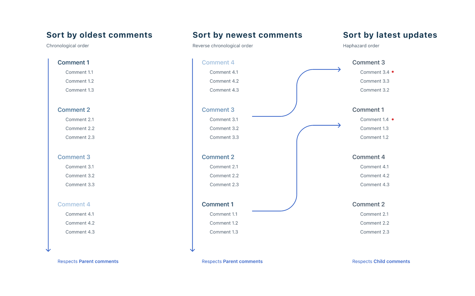 - Latest Updates First - Displays most recent comment at the top which is inclusive of both parent and child comments