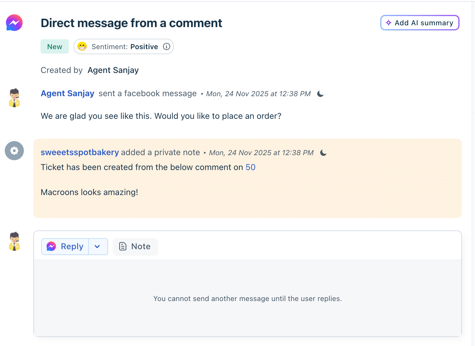 - In the new ticket that is created, the subject would be Direct message from a comment.