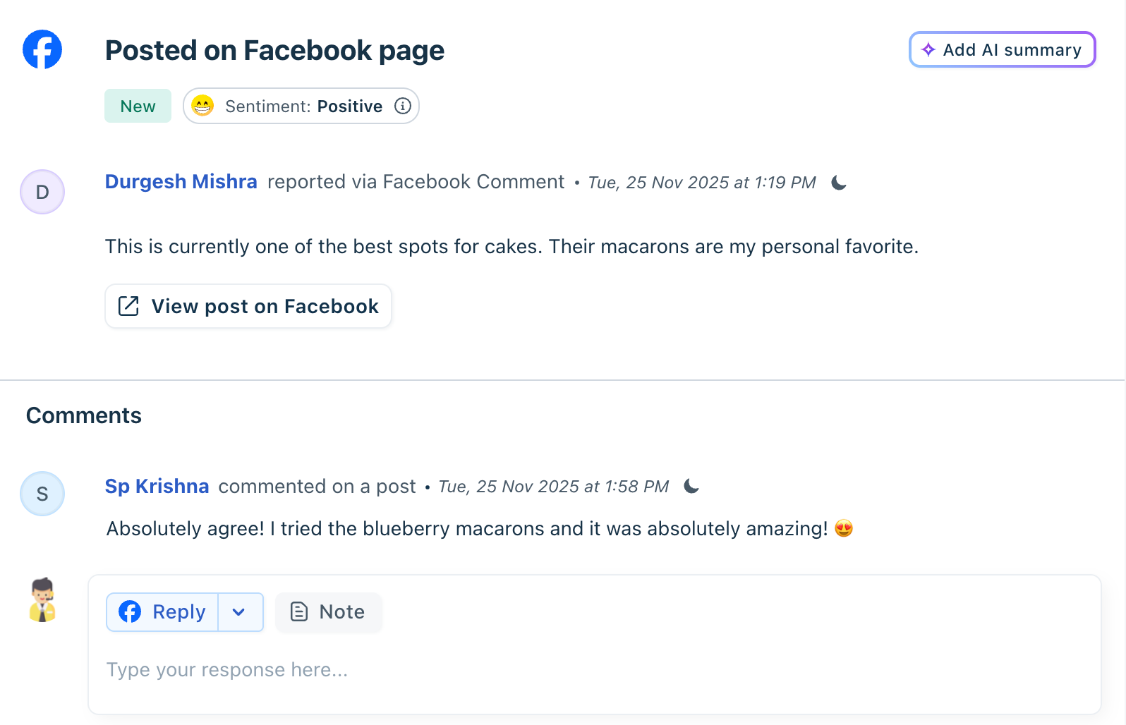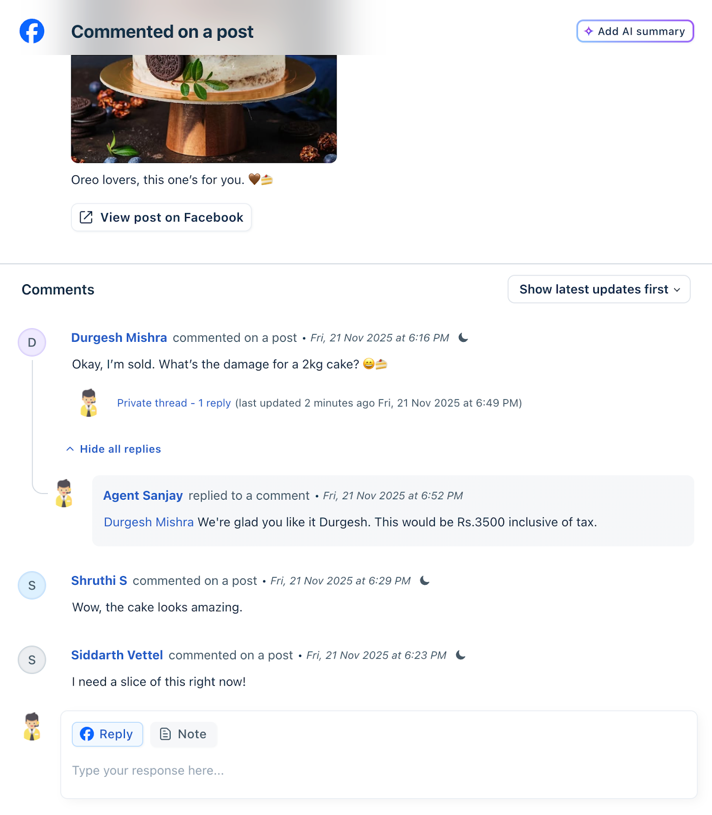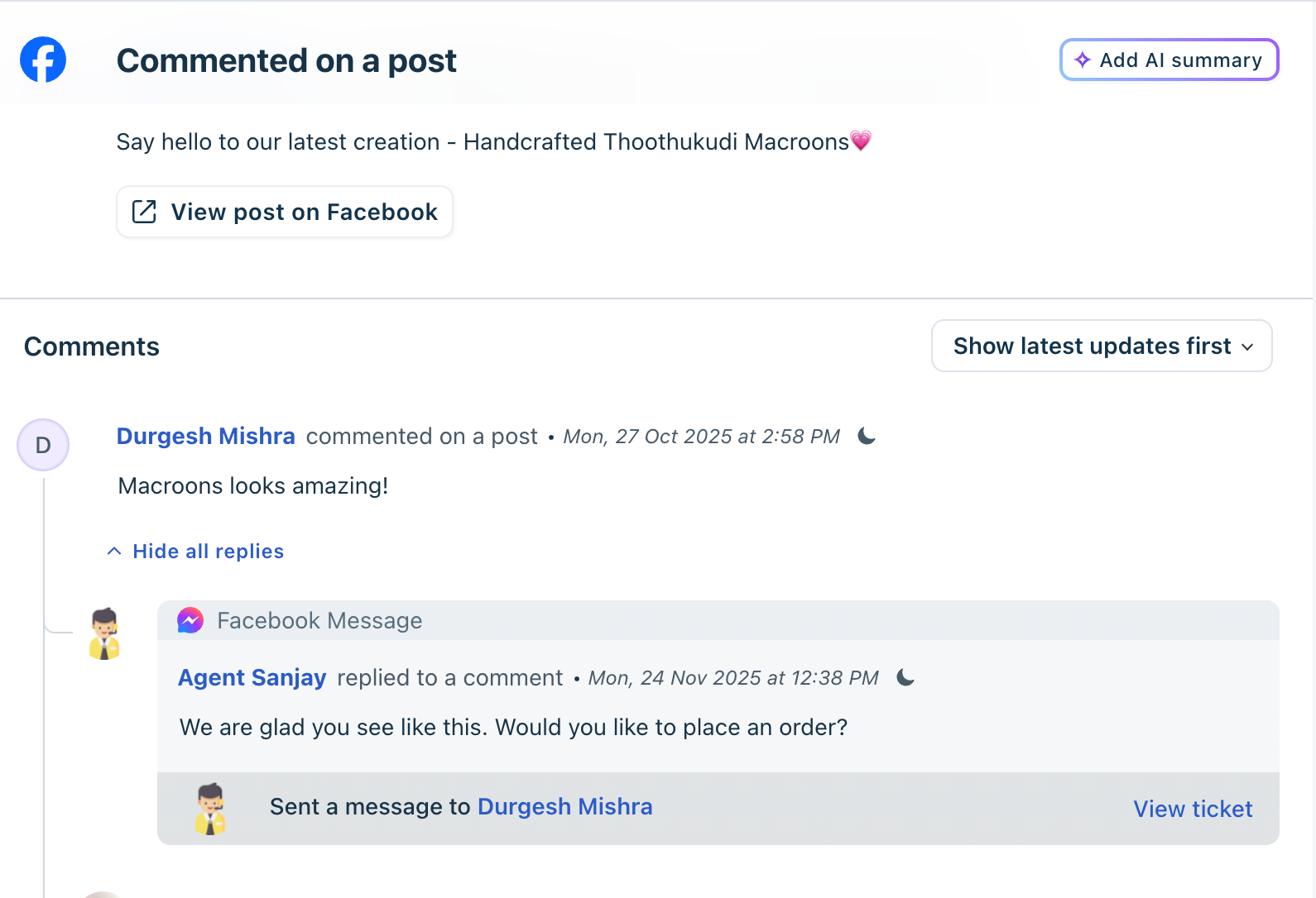 Agents can respond to comments on Facebook posts once the admin has enabled ‘convert comments into tickets’.