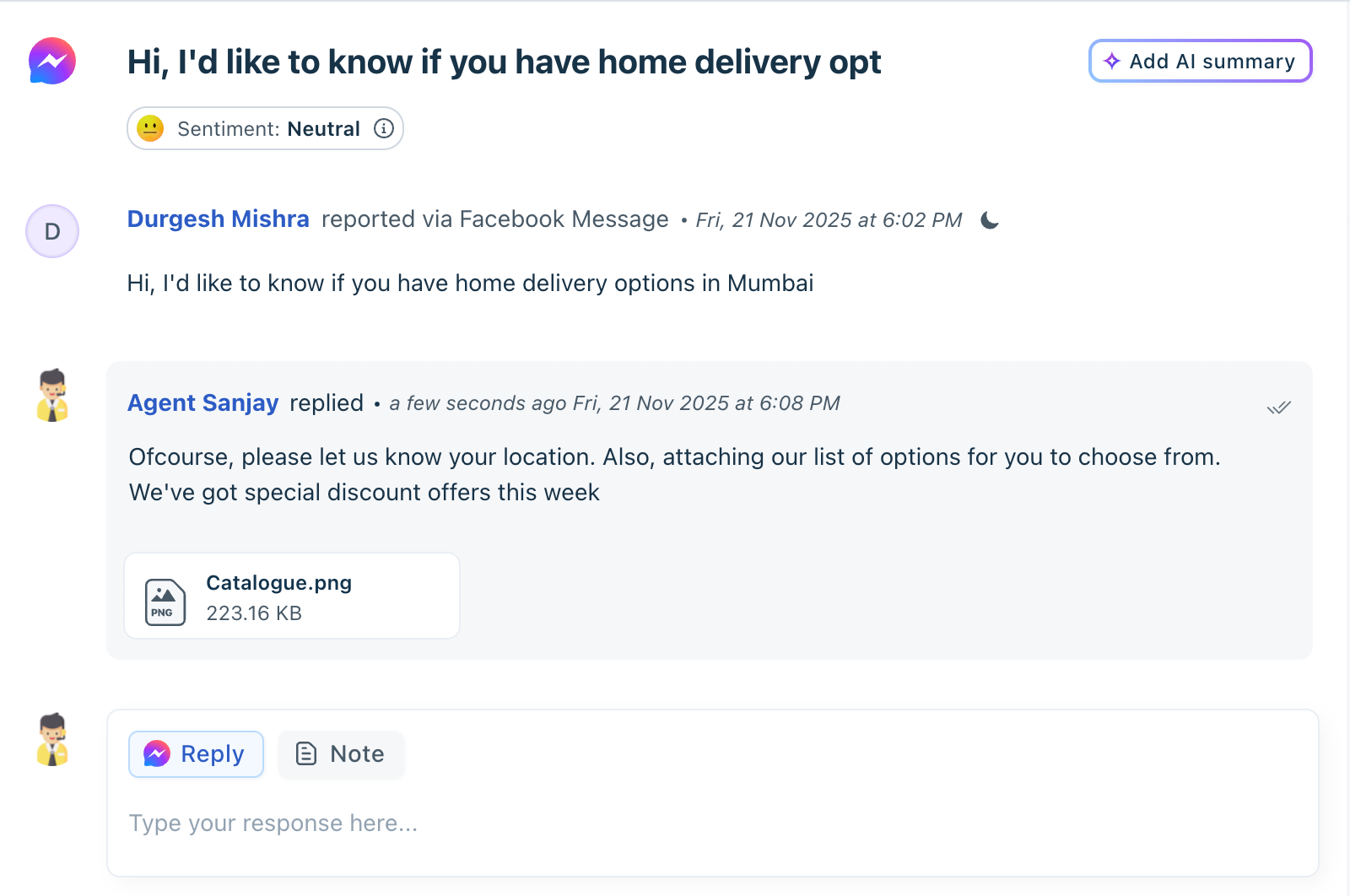 For example, under ticket properties, the source info will appear as ‘Facebook Messages – India Support. Here, ‘India Support’ is the configured source info name for the page, and the source will be prefixed accordingly.