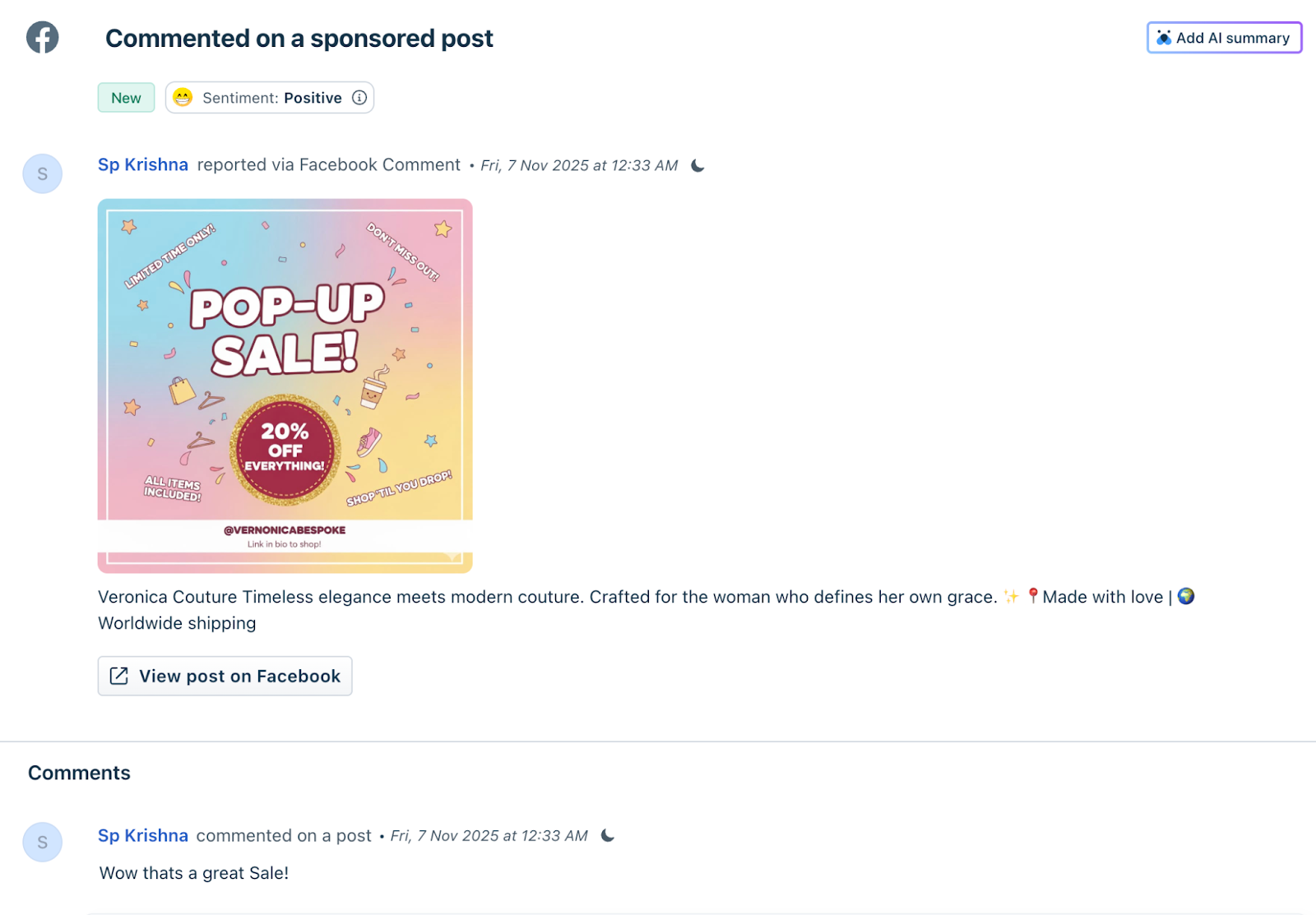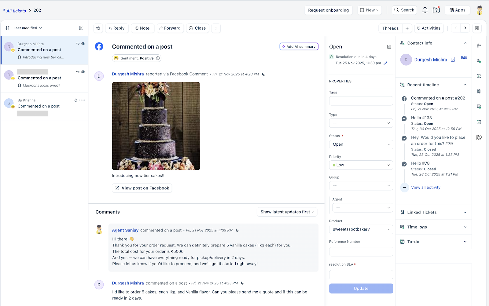 - All comments on the same post appear as a single threaded ticket, similar to how it’s available in Facebook today.