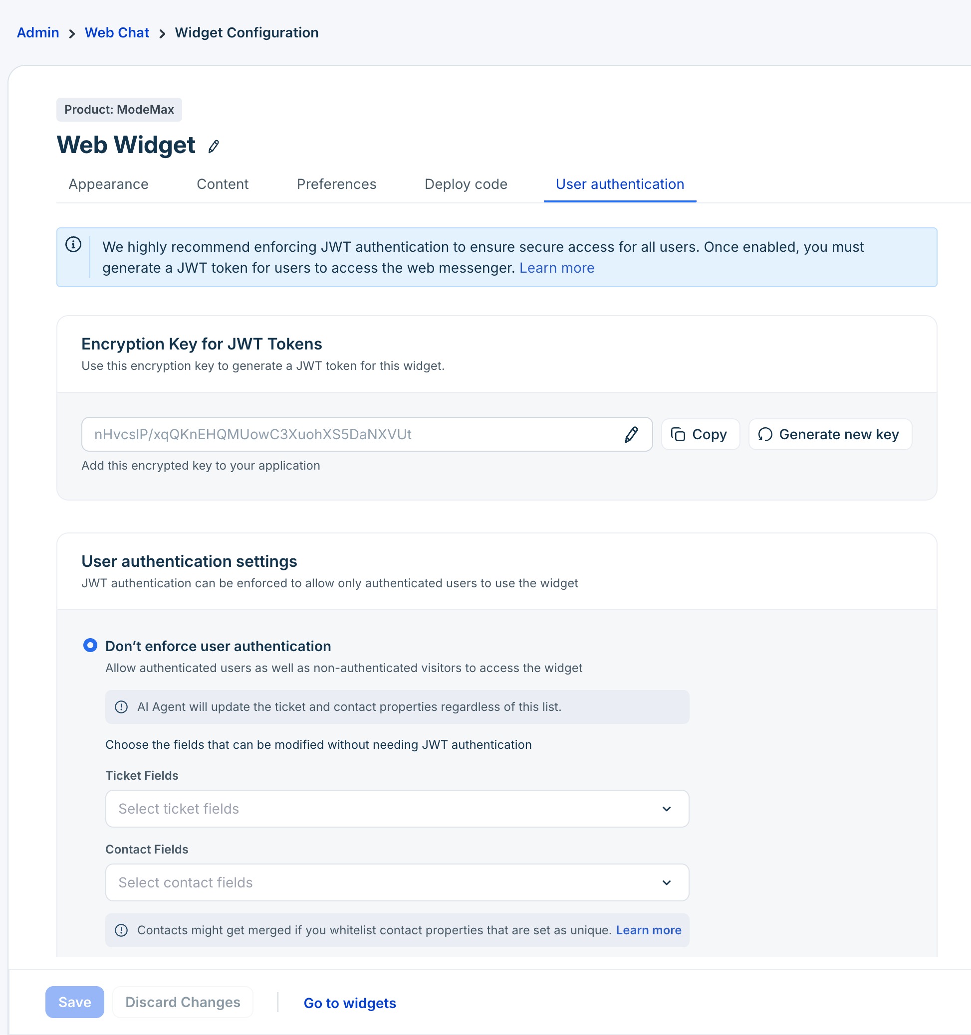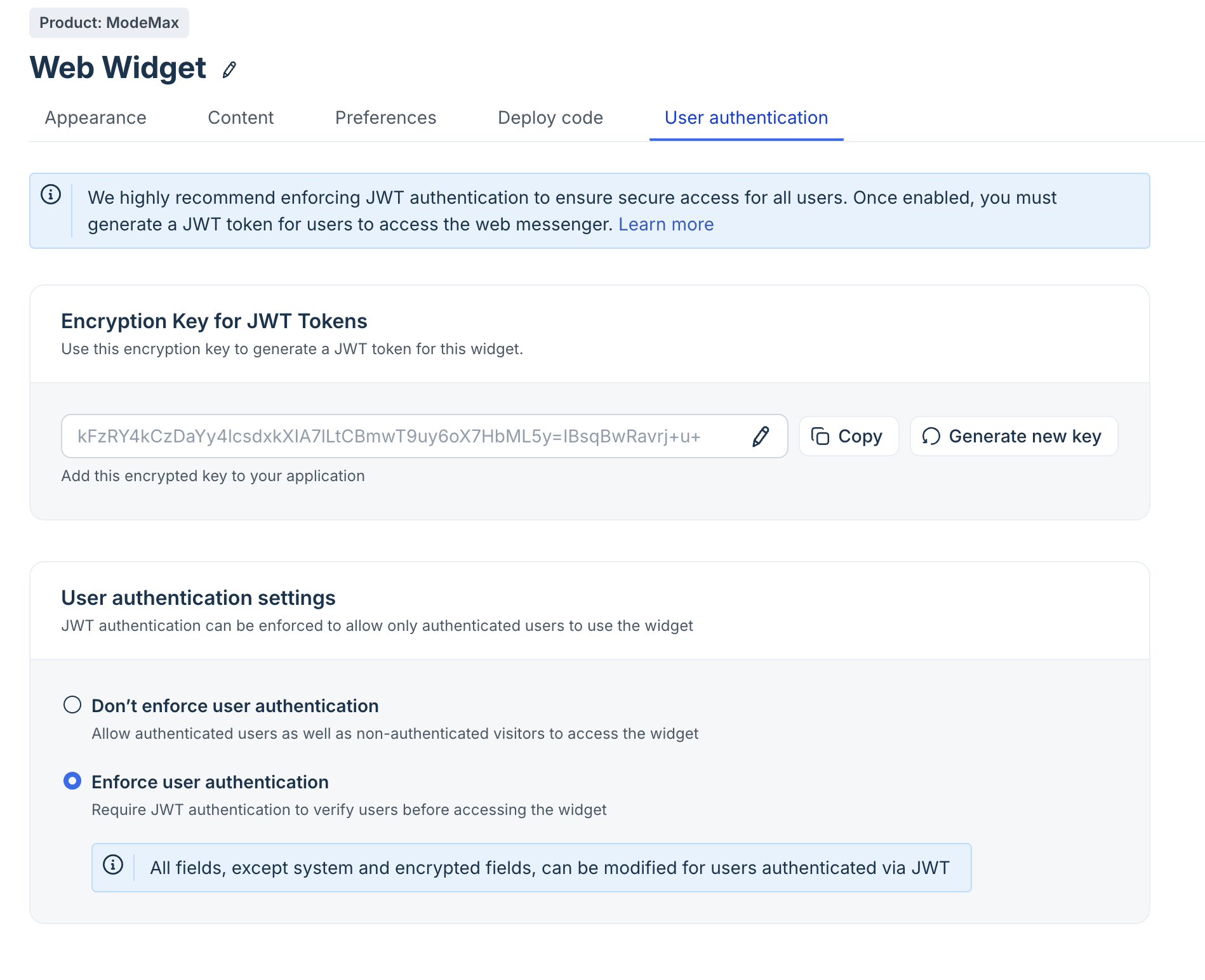 When user authentication is enforced on Web Chat Widgets, JSON Web Token (JWT) authentication becomes mandatory for both authenticated and anonymous users. This ensures that every interaction, whether from a registered customer or a visitor, is securely validated through token verification.