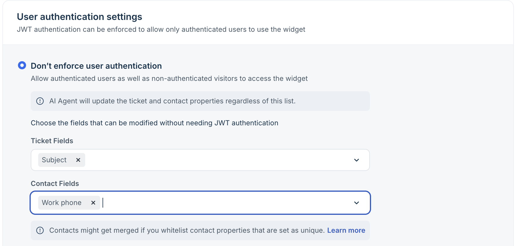 - Select the ticket fields and contact fields that can be modified even if JWT authentication is disabled.