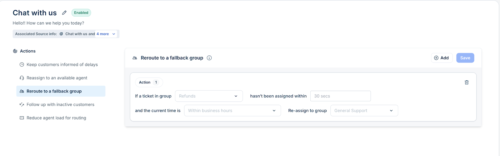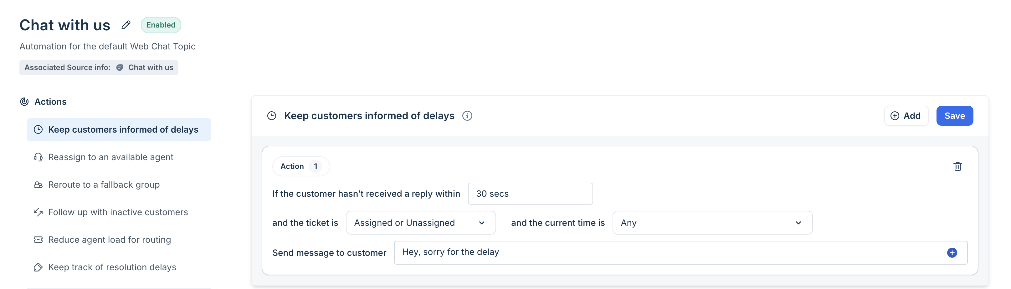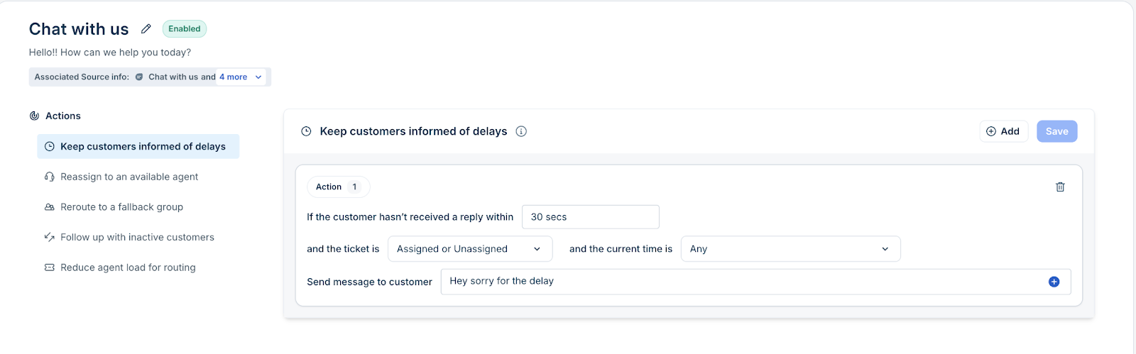 Note: Click +Add to add multiple rules (up to 5) or multiple follow-ups. Each one can send a different message based on the delay or ticket.