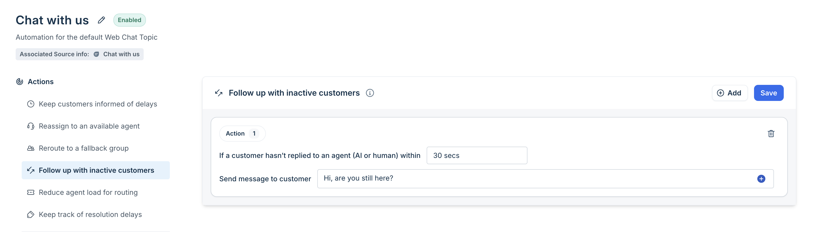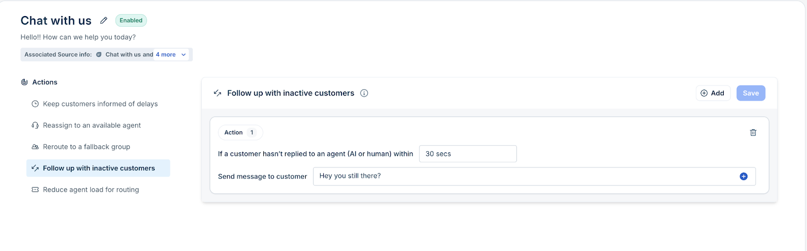 Use this rule to nudge customers who go silent during a conversation. For example, if a customer stops replying for 30 seconds while talking to either an AI Agent or a human agent, you can automatically send a gentle follow-up, such as “Hey, you still there?” to re-engage them and keep the conversation moving.