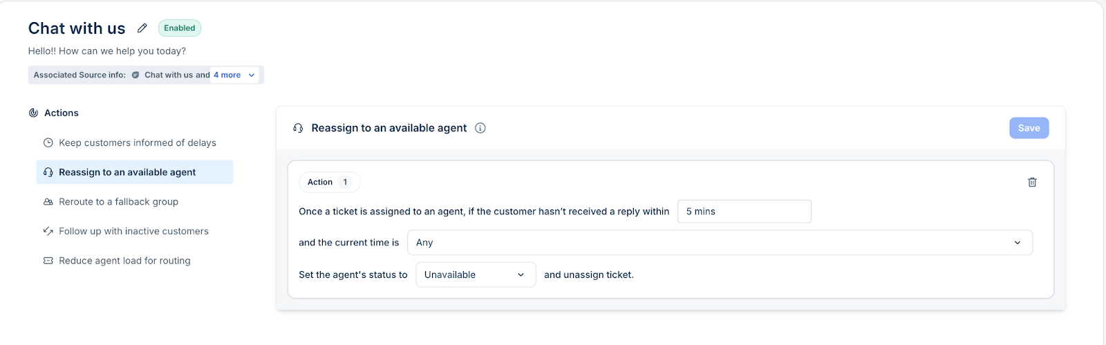 This rule is designed for situations where an assigned agent is unable to respond in a timely manner. The rule unassigns tickets that have been left unanswered by the assigned agent for a specified duration (e.g., 5 minutes).