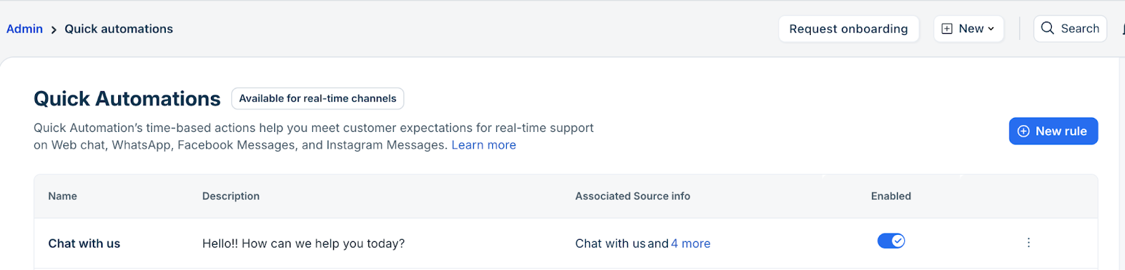 Note: Quick Automations are only applicable to tickets where the source info (field value) is from Web Chat, SDKs, WhatsApp, Facebook direct message, or Instagram Direct Messages. They operate independently from the existing Automations module.