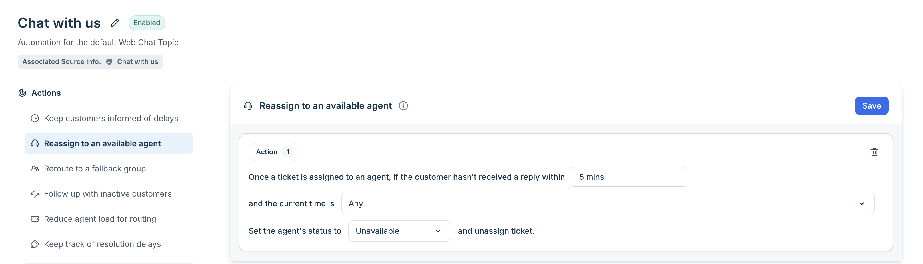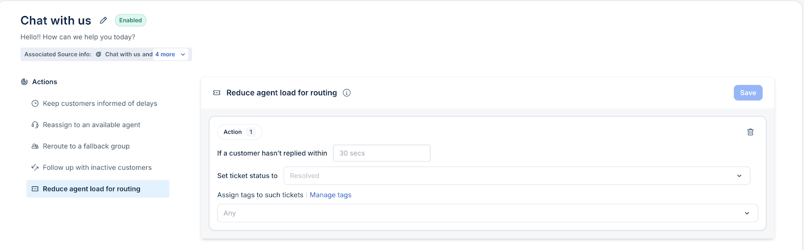 Use this Action to automatically change the ticket status if the customer is inactive. For example, if an agent is fully loaded with three tickets, but two of those have no customer response, you can automatically update the status of those tickets. This frees up the agent’s capacity, allowing new incoming tickets to be assigned to them.