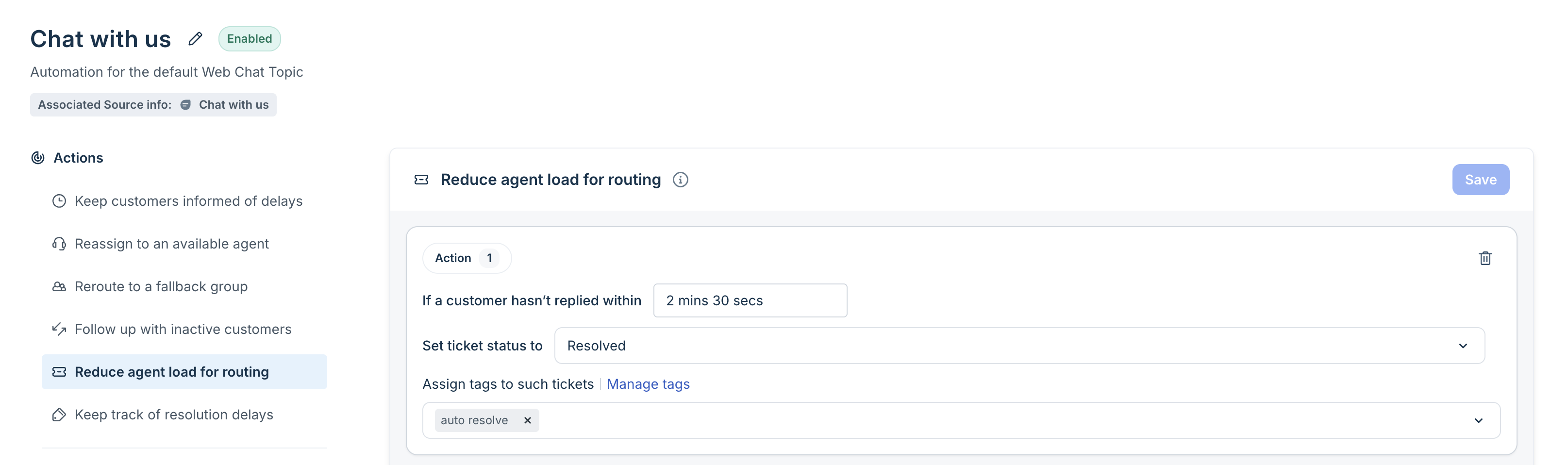 What you do: Add one or more tags so you can identify and filter these auto-resolved or inactive chat tickets later. Click Manage tags to view the list of tags.