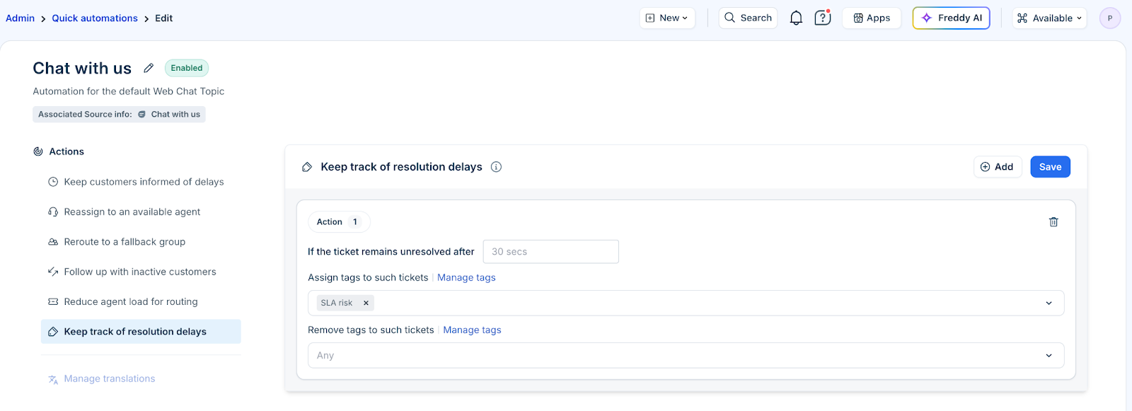 What you do: Add a tag (for example, SLA risk or waiting_in_queue) to easily filter and track delayed tickets. Click Manage tags to create or view available tags.