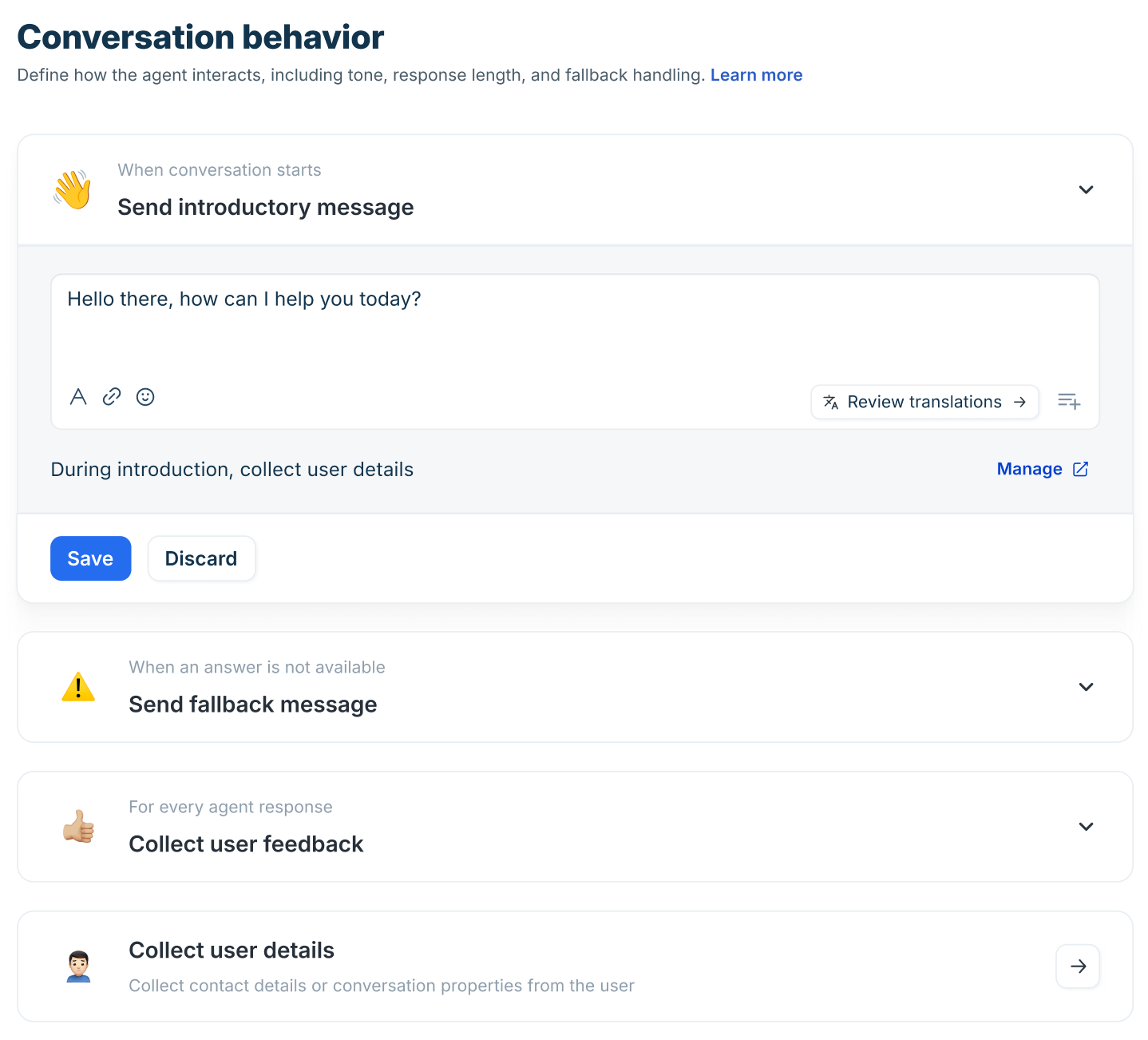 The Conversation behaviour settings help you standardize greetings, handle unanswered queries, collect structured information, and manage conversation closure or escalation.